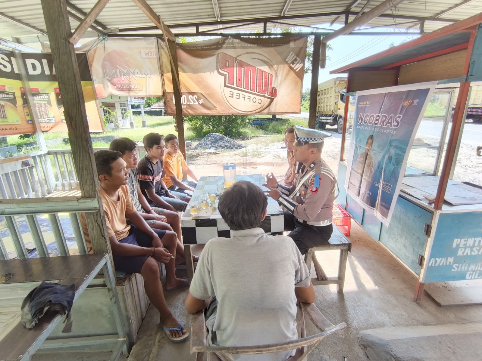 Kegiatan ini berlangsung secara santai namun penuh edukasi, dengan mengajak para sopir angkutan untuk berdiskusi sambil menikmati kopi bersama petugas kepolisian.