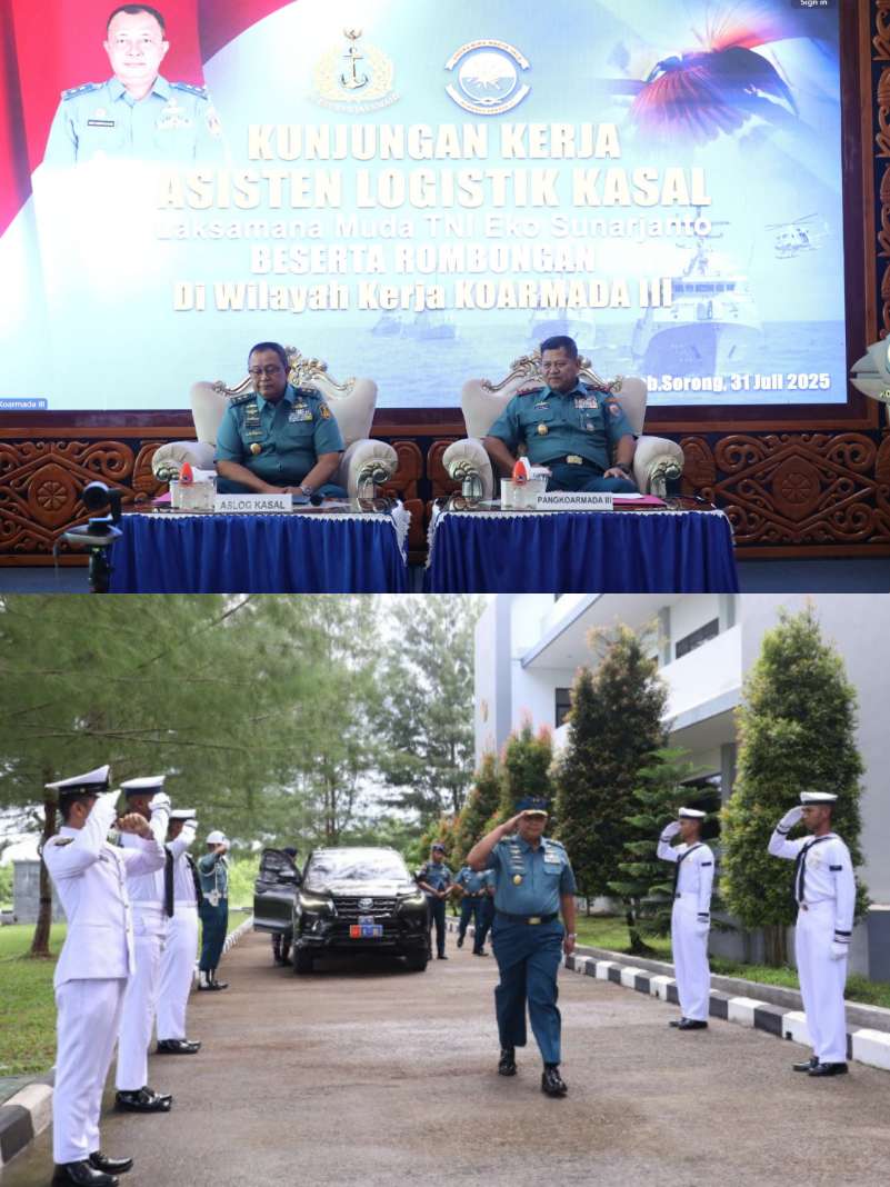 Katapop, Kab. Sorong, 31 Juli 2025 — Komando Armada III (Koarmada III) menerima kunjungan kerja dari Asisten Logistik (Aslog) Kepala Staf Angkatan Laut (Kasal) Laksamana Muda TNI Eko Sunarjanto di Markas Koarmada III, Katapop, Kabupaten Sorong. Turut hadir dalam rombongan, Kepala Dinas Perbekalan TNI AL (Kadisbekal) Laksamana Pertama TNI Dr. Hery Setiyo Nugroho, S.E., M.A.P., CHRMP., serta Kepala Dinas Material TNI AL (Kadismatal) Laksamana Pertama TNI Suryaman, S.T.