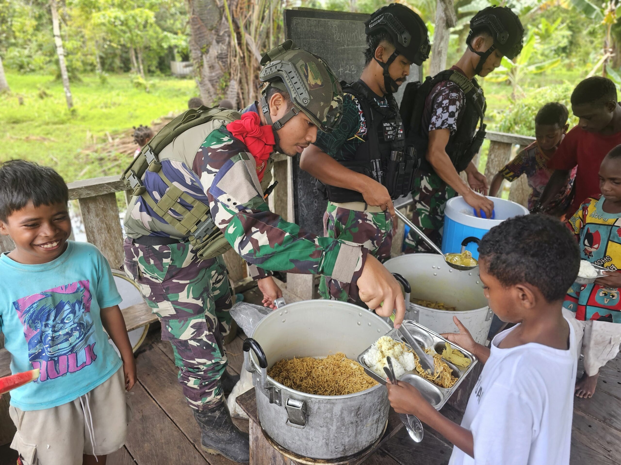 Papua, PW 30 Agustus 2025 – Di pelosok Kabupaten Asmat, Papua Selatan, harapan baru merekah di wajah anak-anak SD Rimba YPPK Yan Smith Santo Aloysius Mumugu 2. Bukan hanya menjaga keamanan perbatasan, Satuan Tugas Pengamanan Perbatasan (Satgas Pamtas) Mobile Yonif 733/Masariku hadir membawa kebahagiaan lewat program “Masariku Peduli Gizi”. Bayangkan, mata berbinar penuh semangat menyambut kedatangan para prajurit TNI yang membawa sepiring nasi hangat dengan lauk bergizi lengkap. Ayam goreng renyah, ikan segar, telur dadar, sayuran hijau, dan buah-buahan segar menjadi menu istimewa yang disantap dengan lahap oleh seluruh…