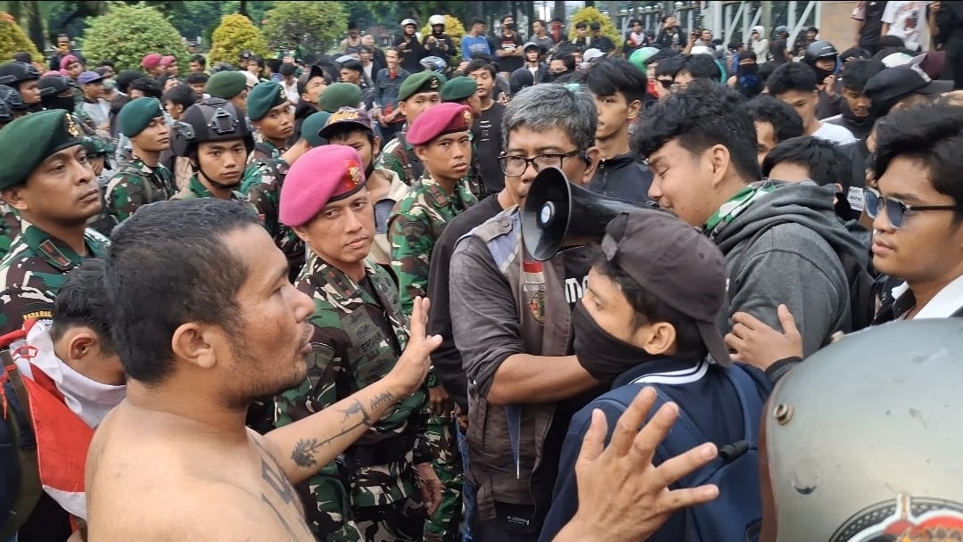 TNI AL, Pasmar 1. Di bawah pimpinan Komandan Batalyon Arhanud 1 Marinir (Danyon Arhanud 1 Mar) Letkol Marinir Verdian, S.Hub.Int., M.Tr.Opsla., prajurit Pasmar 1 melaksanakan tugas pengamanan aksi unjuk rasa di wilayah Gedung DPR MPR, Mabes Polri dan Mapolda Metro Jaya, Sabtu (30/08/2025).