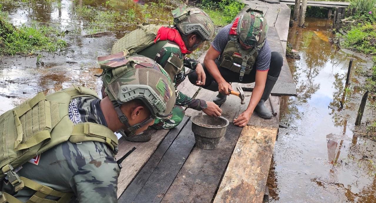 Prajurit Satgas Pamtas Mobile Yonif 733/Masariku turun tangan memperbaiki jembatan, membuka kembali akses pendidikan bagi anak-anak di perbatasan.