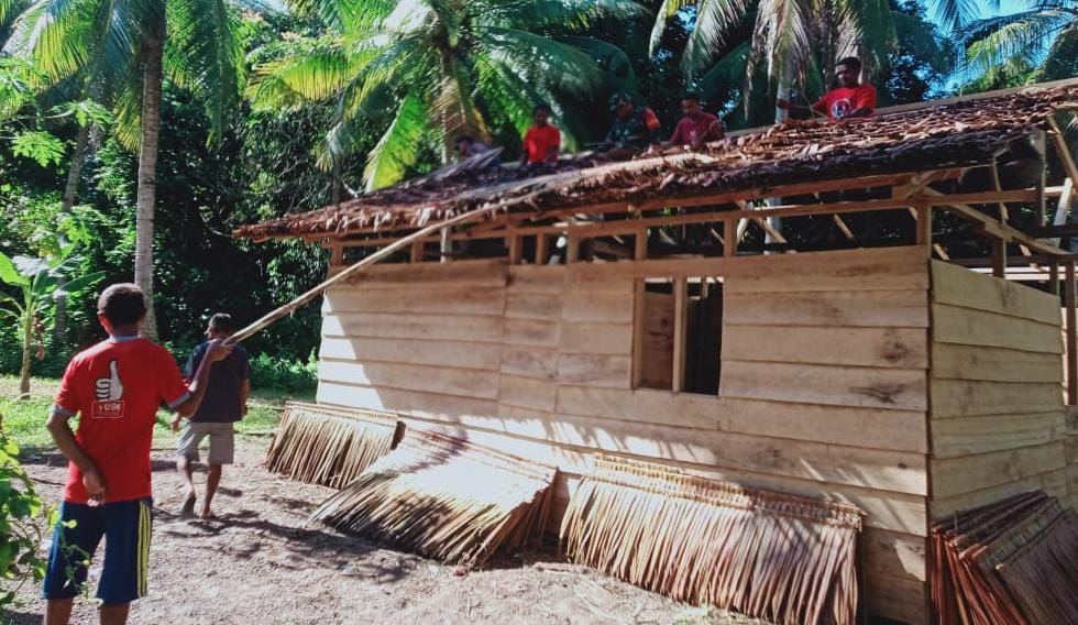 Dalam kegiatan tersebut, Serda Elieser Maimina bersama warga saling bergotong royong mengangkat dan memasang atap rumbia pada bagian atap rumah.