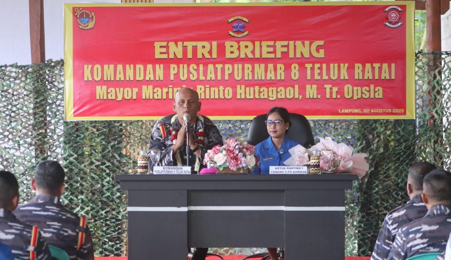 TNI AL, Dispen Kormar (Lampung) PW : Komandan Puslatpurmar-8 Teluk Ratai Mayor Marinir Rinto Hutagaol, M.Tr.Opsla, didampingi oleh Ketua Ranting I Cabang 5 PG Kormar Ny. Maylani Rinto Hutagaol, Gelar Entry Briefing di Mako Puslatpurmar-8 Teluk Ratai. Kec. Teluk Pandan, Kab. Pesawaran, Lampung. Selasa (02/09/2025). Rangkaian kegiatan diawali penyambutan kedatangan Komandan Puslatpurmar-8 Teluk Ratai oleh seluruh prajurit Puslatpurmar-8 Teluk Ratai dengan menyanyikan lagu “Selamat Datang Pahlawan Muda” kemudian menuju Lobi Mako untuk melaksanakan persiapan entry briefing. Dalam kesempatan entry briefing, Komandan Puslatpurmar-8 Teluk Ratai membuka kegiatan tersebut dengan memperkenalkan diri,…