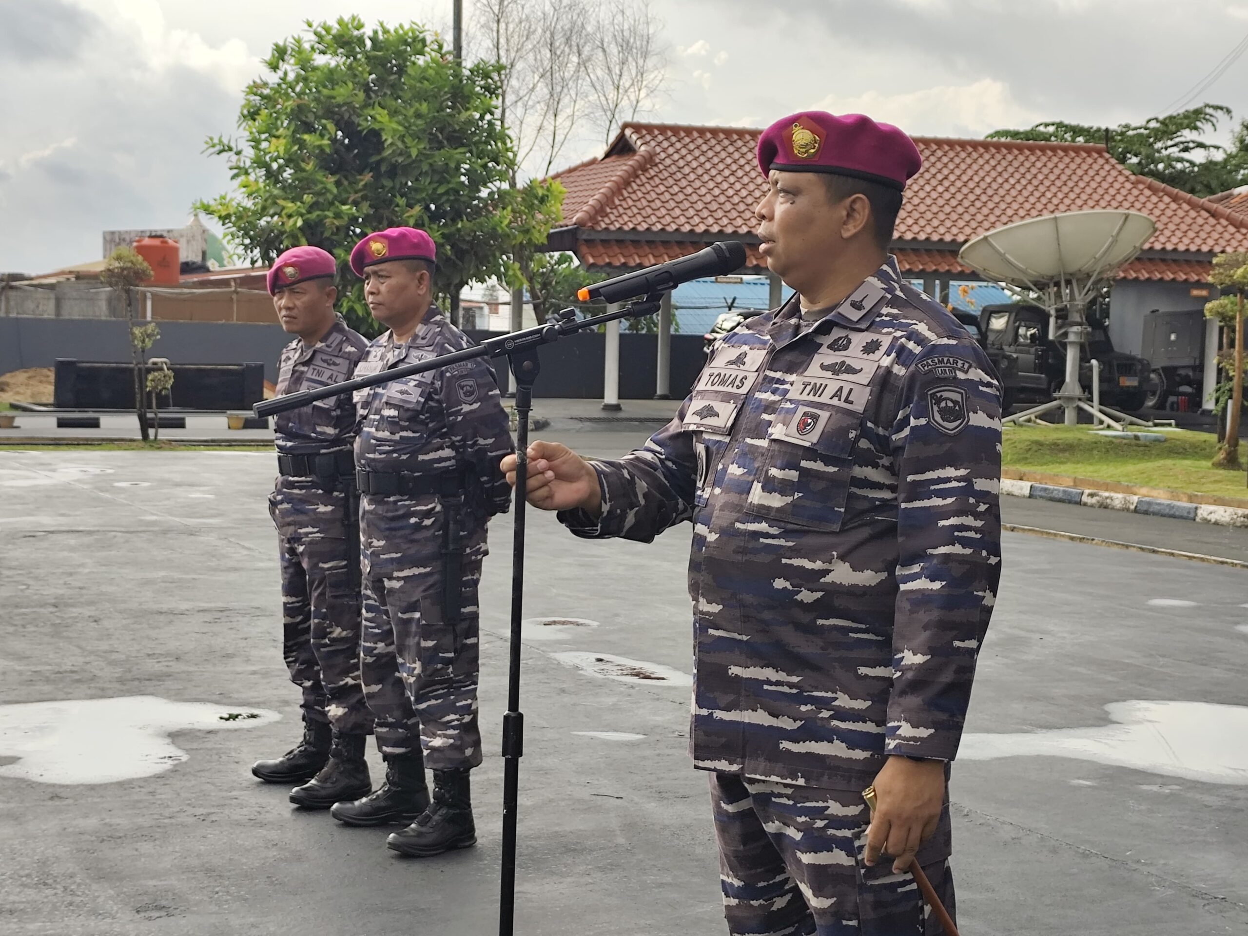 TNI AL, Pasmar 1. Komandan Batalyon Marinir Pertahanan Pangkalan (Danyonmarhalan) IV Batam Letkol Marinir Tomas Febrianto, M.Tr.Opsla., mengambil Apel khusus prajuritnya dalam rangka kesiapan pasukan pengamanan Kota Batam, di lapangan Apel Mako Yonmarhalan IV Batam, Selasa (02/09/2025) .