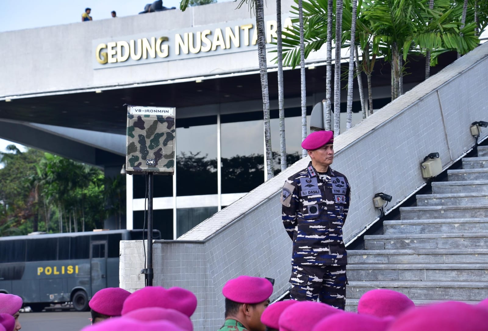 TNI AL, Dispen Kormar, Pasmar 1 (Jakarta). Komandan Pasmar 1 (Danpasmar 1) Mayjen TNI (Mar) Ili Dasili, S.E., mendampingi Kepala Staf TNI Angkatan Laut (Kasal) Laksamana TNI Dr. Muhammad Ali dan Panglima Korps Marinir (Pangkormar) Letjen TNI (Mar) Dr. Endi Supardi, S.E., M.M., M.Tr.Opsla., CHRMP., CRMP., untuk meninjau prajurit yang sedang melaksanakan Pengamanan objek vital di Gedung DPR/MPR Senayan, Jakarta Pusat, Kamis (04/09/2025). Kunjungan ini dilaksanakan dalam rangka meninjau langsung kesiapan pasukan TNI AL Korps Marinir yang tergabung dalam pengamanan aksi unjuk rasa di sekitar Gedung DPR, guna memberikan arahan…