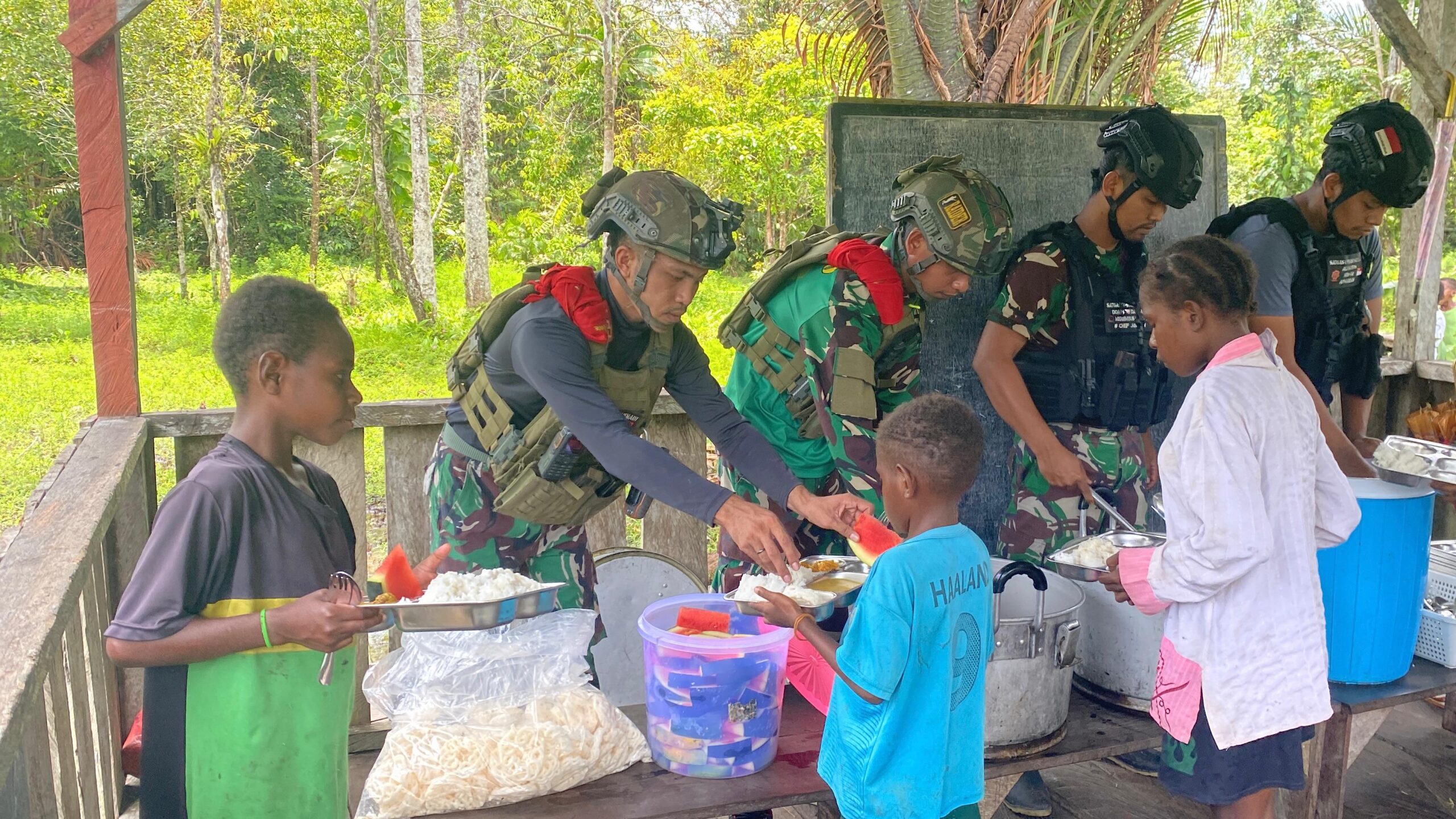 Program ini dilaksanakan pada hari Sabtu (13/09) menyasar siswa-siswi SD Rimba Mumugu. Para prajurit Satgas Pamtas Mobile Yonif 733/Masariku menyiapkan dan membagikan makanan bergizi seperti nasi, lauk-pauk, sayuran, dan buah-buahan kepada seluruh siswa.