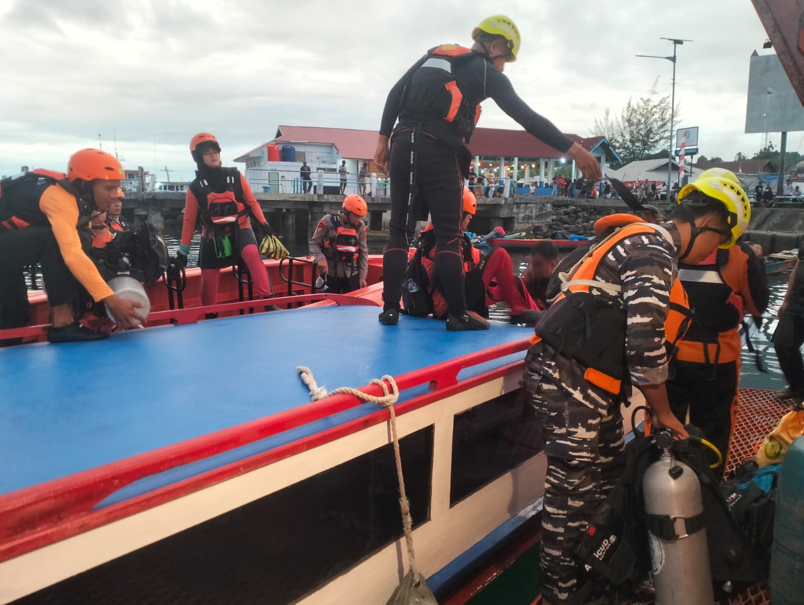 TNI AL, Dispen Kormar, Pasmar 1 (Mentawai). Prajurit Batalyon Marinir Pertahanan Pangkalan (Yonmarhanlan) II Padang yang melaksanakan BKO ke Posal Simabuk, beserta Tim SAR Gabungan melaksanakan evakuasi dan pencarian korban kapal nelayan tenggelam di perairan Mapadegat Sipora Utara Kabupaten Kep. Mentawai, Sumatera Barat, Senin (15/09/2025).