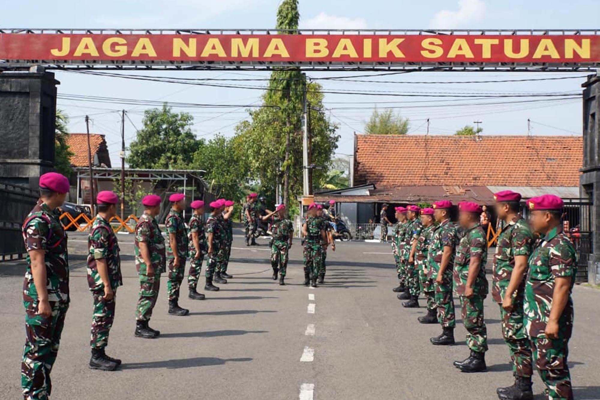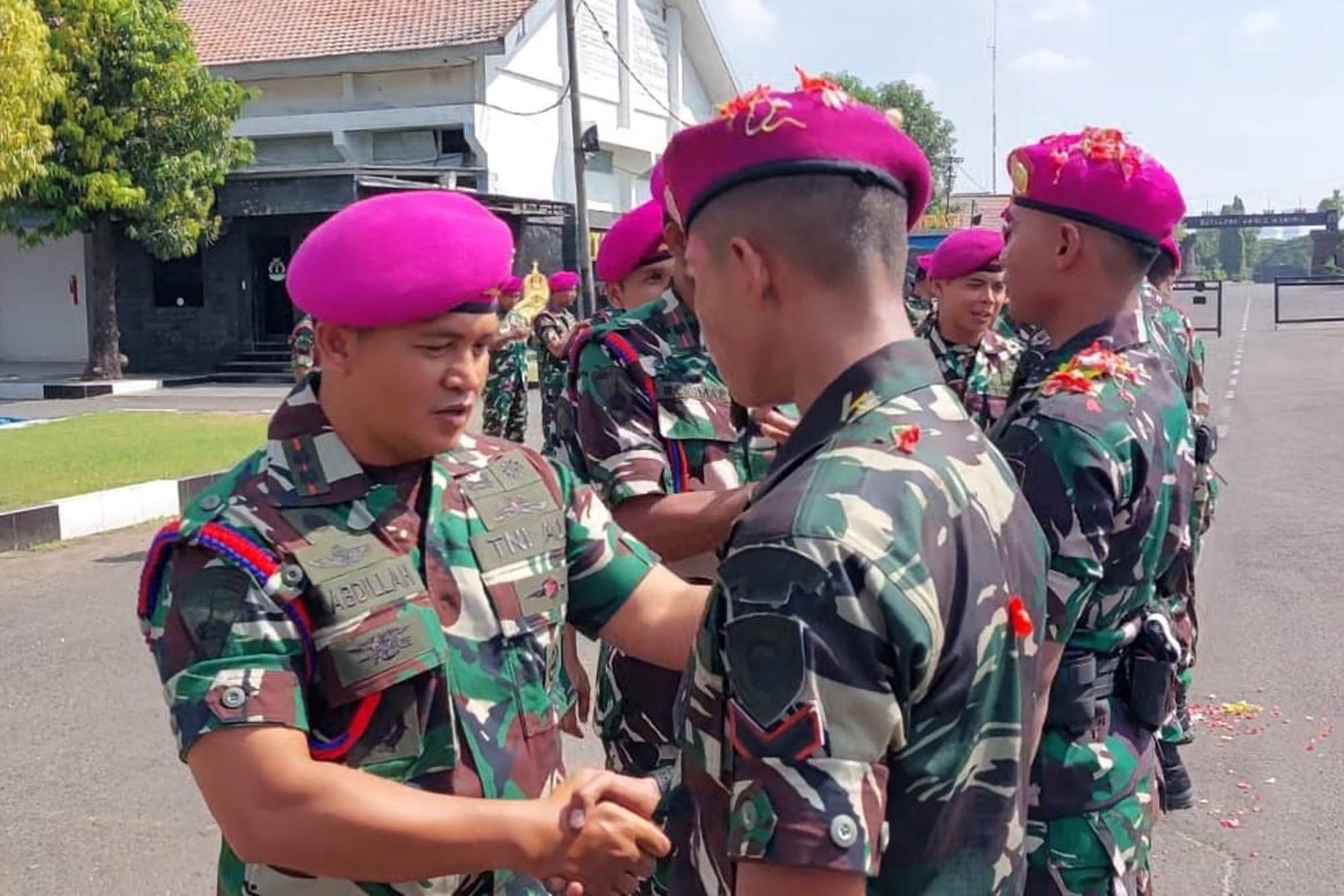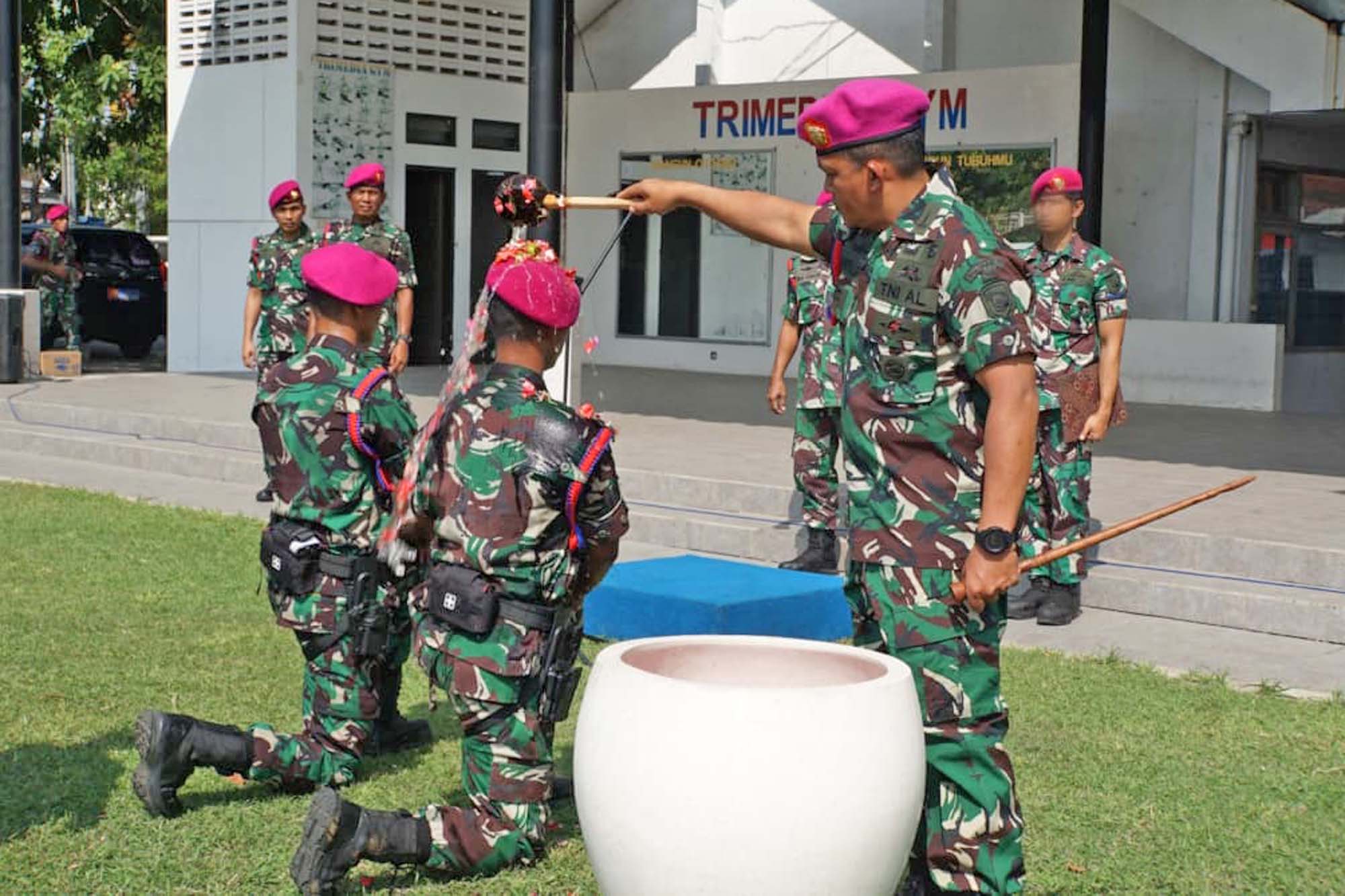 TNI AL, Dispen Kormar (Surabaya) PW : Komandan Detasemen Intai Para Amfibi 2 Marinir (Denipam 2 Mar) Letkol Marinir Mohammad Abdilah M. Tr.Opsla., memimpin upacara tradisi penyambutan 8 prajurit yang usai menyelesaikan Diktaifib LI TA. 2024 – 2025 di depan Tribun Trimedia Denipam 2 Mar Karangpilang, Surabaya. Kamis (18/09/2025).