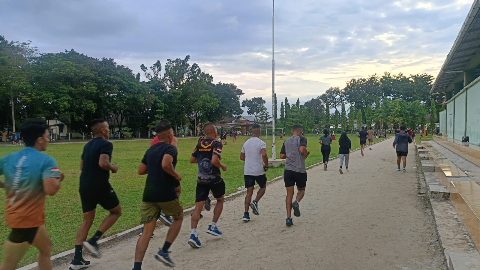 TNI AL, Pasmar 1. Di hari libur, prajurit Tidur Dalam Bintara dan Tamtama Batalyon Marinir Pertahanan Pangkalan (Yonmarhanlan) II Padang mengisi waktu pagi dengan melaksanakan olahraga pagi yang bertempat di Lapangan Wirabraja Sport Center Tarandam, Kota Padang, Sumatera Barat, Minggu (21/09/2025).