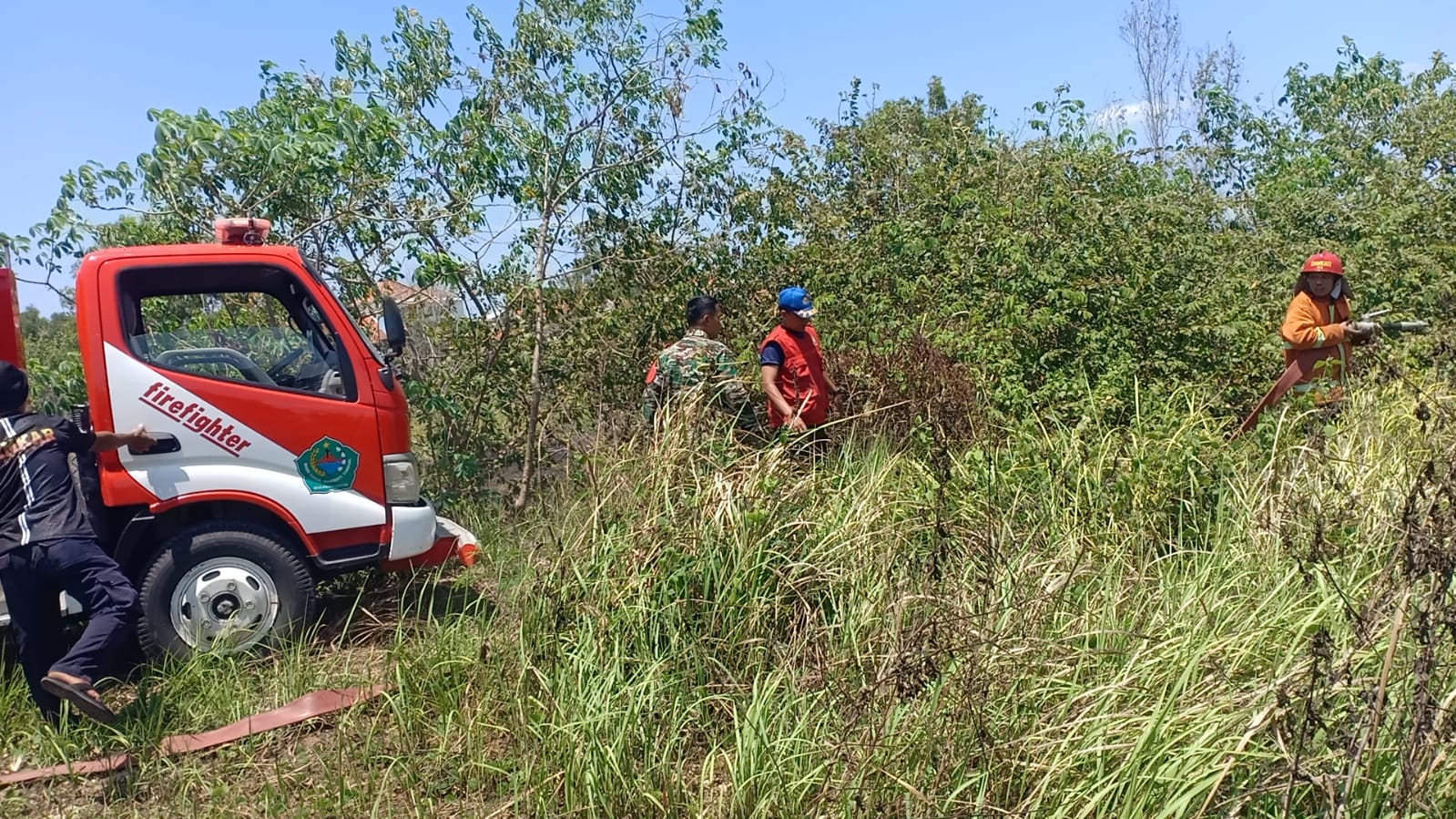 PAMEKASAN PW – Babinsa Kelurahan Lawangan Daya, Koptu Joniawan Agus, bersama petugas pemadam kebakaran sigap membantu proses pemadaman kebakaran lahan kosong yang terjadi di RT 08 RW 03 Kelurahan Lawangan Daya, Kecamatan Pademawu, Minggu (5/10/2025).