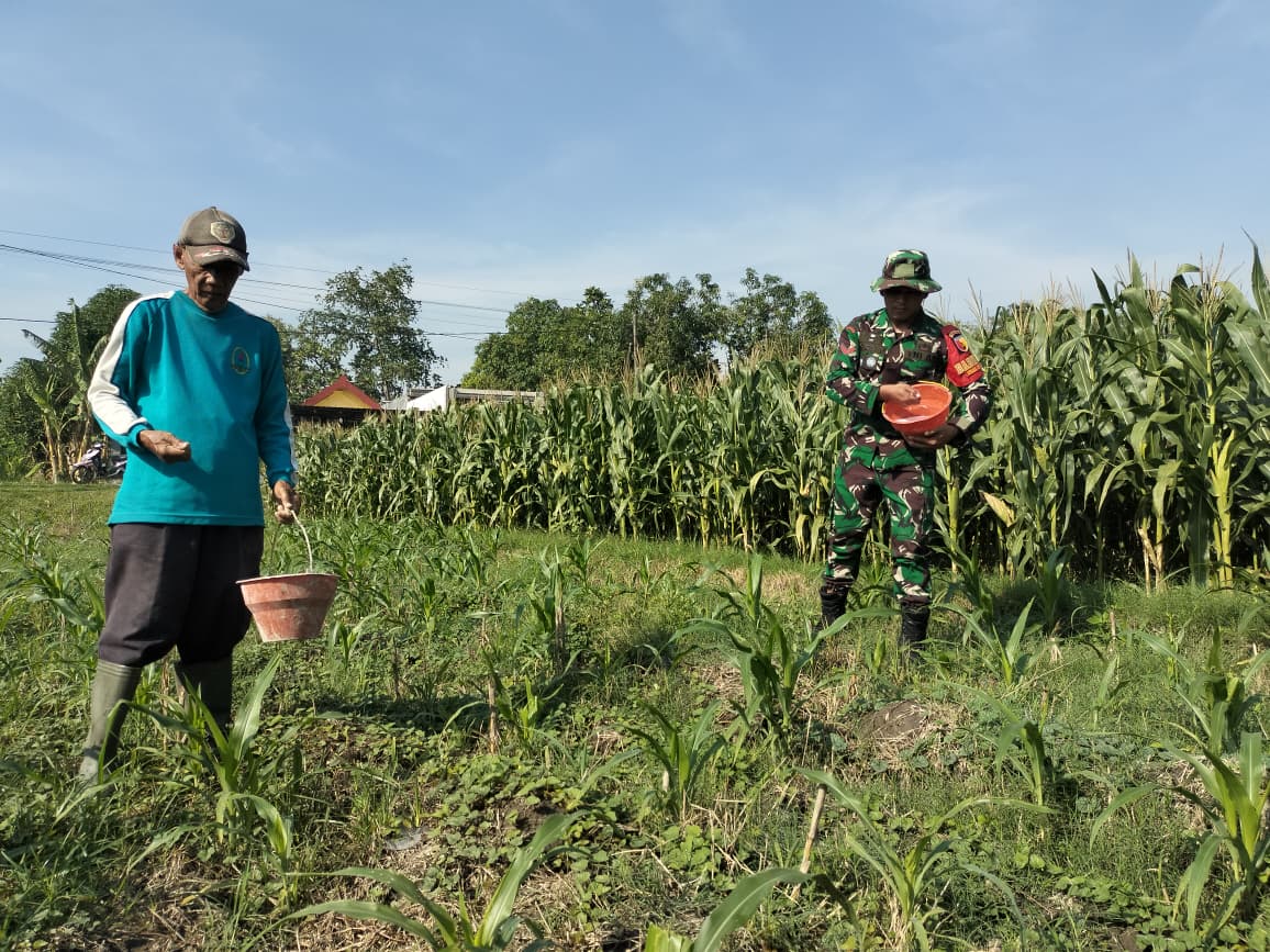 PAMEKASAN PW – Babinsa Desa Terrak Koramil 0826-02 Tlanakan, Kopda Frido Prayoga melaksanakan kegiatan pendampingan kepada petani dengan membantu proses pemupukan tanaman jagung milik Sumanto di Dusun Maronggi, Desa Terrak, Kecamatan Tlanakan, Kabupaten Pamekasan, Senin (6/10).