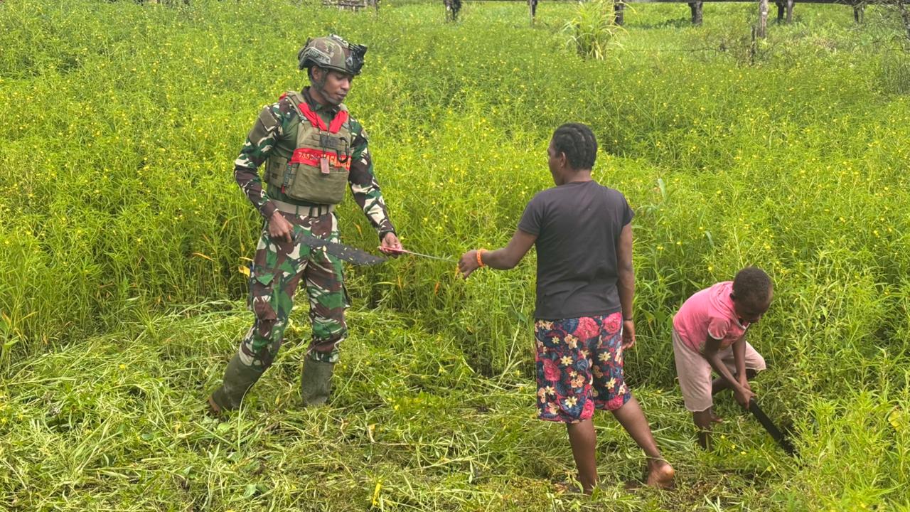 Prajurit Satgas Pamtas Mobile Yonif 733/Masariku dan Masyarakat Bersihkan Lingkungan Gereja Katolik Kampung Mumugu
