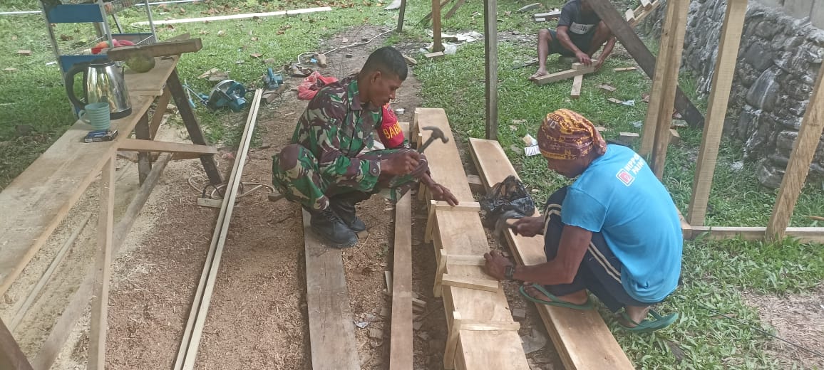 Babinsa Koramil 1513-01/Piru, Serda Fauril Ilpatra, melaksanakan kegiatan membantu warga binaannya, Bapak La Abu, dalam pekerjaan pembangunan rumah di Dusun Eli Besar, Desa Iha, Kecamatan Huamual.