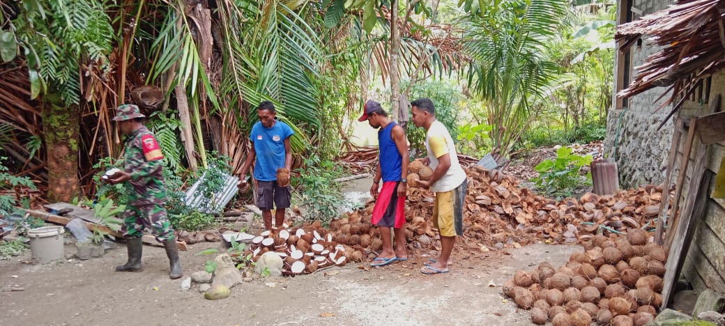Dalam kegiatan tersebut, Sertu W. Sohilait bersama warga tampak membelah dan memisahkan isi kelapa dari tempurungnya, kemudian mengeringkan isi kelapa dengan cara dijemur di bawah sinar matahari dan sebagian melalui proses pengasapan.