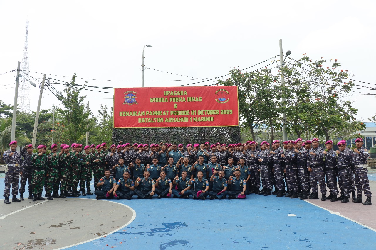 TNI AL, Pasmar 1. Batalyon Arhanud 1 Marinir (Yonarhanud 1 Mar) menggelar Upacara tradisi kenaikan pangkat bagi prajurit yang telah memenuhi syarat dan layak mendapatkan penghargaan atas dedikasi, loyalitas, serta pengabdian kepada Korps Marinir TNI Angkatan Laut bertempat di Lapangan Apel Yonarhanud 1 Kesatrian Marinir Baroto Sardadi Marunda, Jakarta Utara, Rabu (15/10/2025).