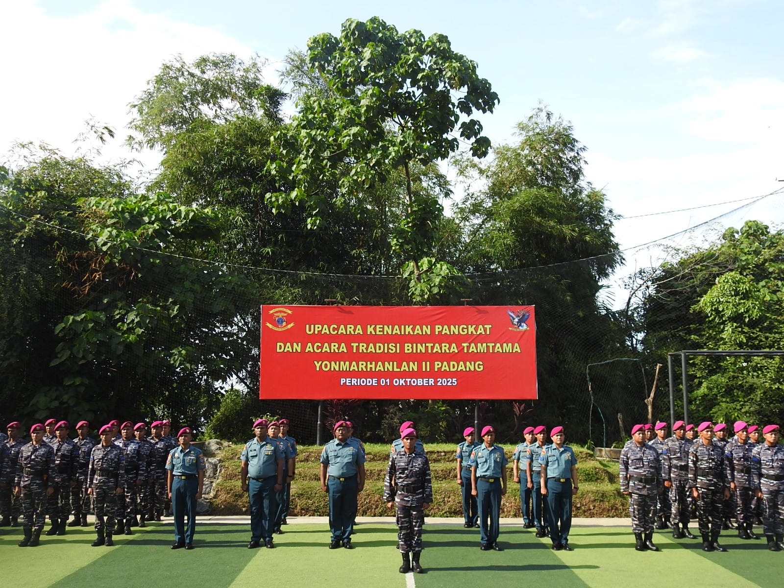 TNI AL, Pasmar 1. Dalam rangka memberikan kebanggaan bagi prajurit, Komandan Batalyon Marinir Pertahanan Pangkalan (Danyonmarhanlan) II Padang Letkol Marinir Afrison Taufik menggelar Upacara kenaikan pangkat prajuritnya periode 01 Oktober 2025 yang bertempat di Lapangan Yonmarhanlan II Padang, Jln. Sutan Syahrir, Bukit Putus, Kota Padang, Provinsi Sumatera Barat. Rabu (15/10/2025).