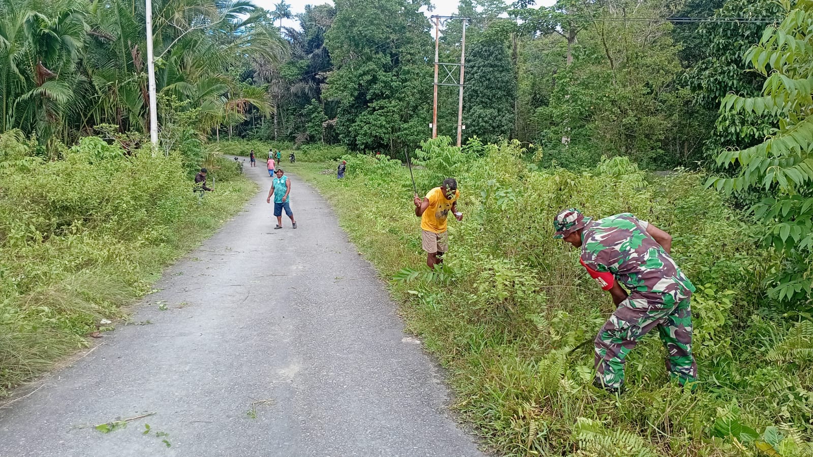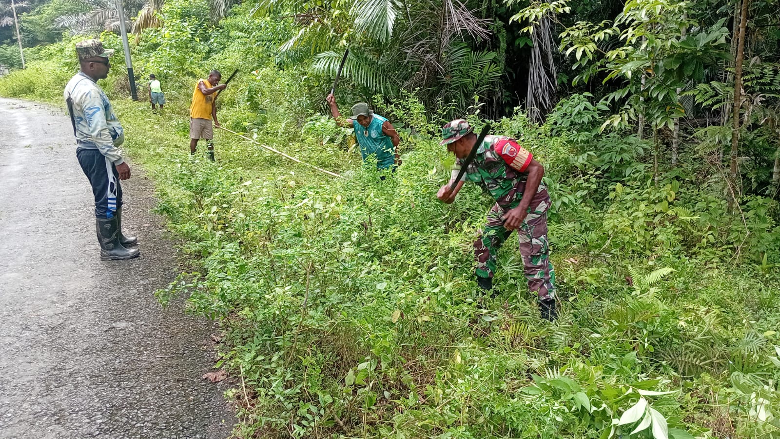Dengan penuh semangat, Babinsa bersama warga bahu-membahu membersihkan semak dan rumput liar yang tumbuh di pinggir jalan agar akses menuju desa menjadi lebih rapi, aman, dan nyaman dilalui kendaraan maupun pejalan kaki.
