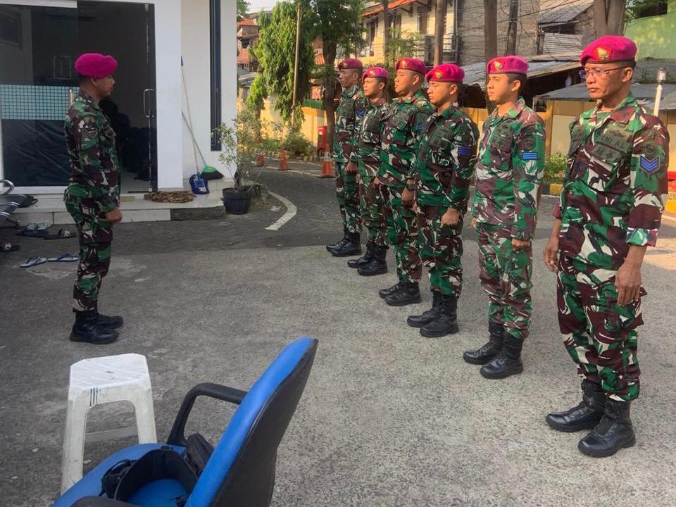 TNI AL, Pasmar 1. Prajurit Resimen Bantuan Tempur 1 Marinir (Menbanpur 1 Mar) melaksanakan Apel Pengamanan (Pam) di area pintu tol Lingkar Dalam Jasa Marga, Cililitan, Jakarta Timur, Selasa (21/10/2025).