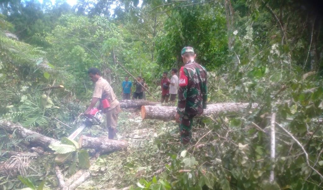 Mengetahui kondisi tersebut, Babinsa bersama beberapa warga masyarakat langsung turun tangan membantu memotong kayu yang akan digunakan sebagai bahan perbaikan.