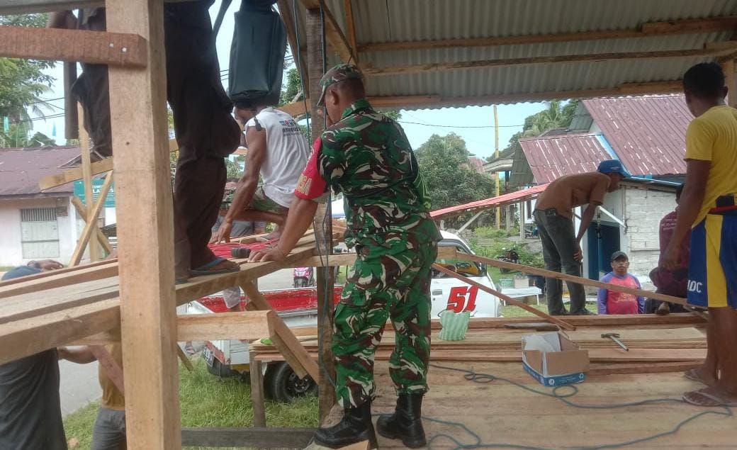 SBB PW 01 November 2025 — Babinsa Koramil 1513-01/Piru, Serka La Ode Arwan, bersama warga Dusun Resetlemen Pulau Osi, Desa Eti, Kecamatan Seram Barat, Kabupaten Seram Bagian Barat, melaksanakan kegiatan kerja bakti pembangunan pos ronda.