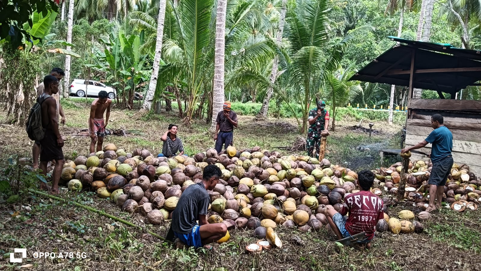 Kegiatan ini dilakukan secara gotong royong bersama beberapa warga Desa Nuniali. Dalam kegiatan tersebut, Serda Yohanis bersama warga terlihat aktif membantu mulai dari proses membelah kelapa hingga penjemuran daging kelapa yang telah dipisahkan dari tempurung.
