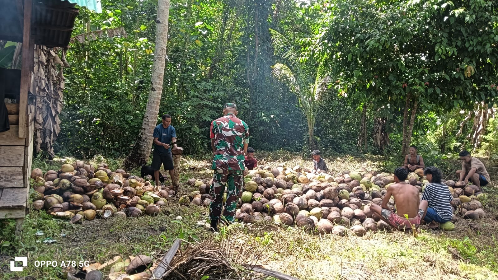 SBB PW Selasa, 04 November 2025 — Babinsa Koramil 1513-02/Taniwel, Desa Nuniali, Kecamatan Taniwel, Kabupaten Seram Bagian Barat, Serda Yohanis B. Tupasouw melaksanakan kegiatan bakti bersama masyarakat dengan membantu Bapak Panus Sekerone mengolah kelapa menjadi kopra.