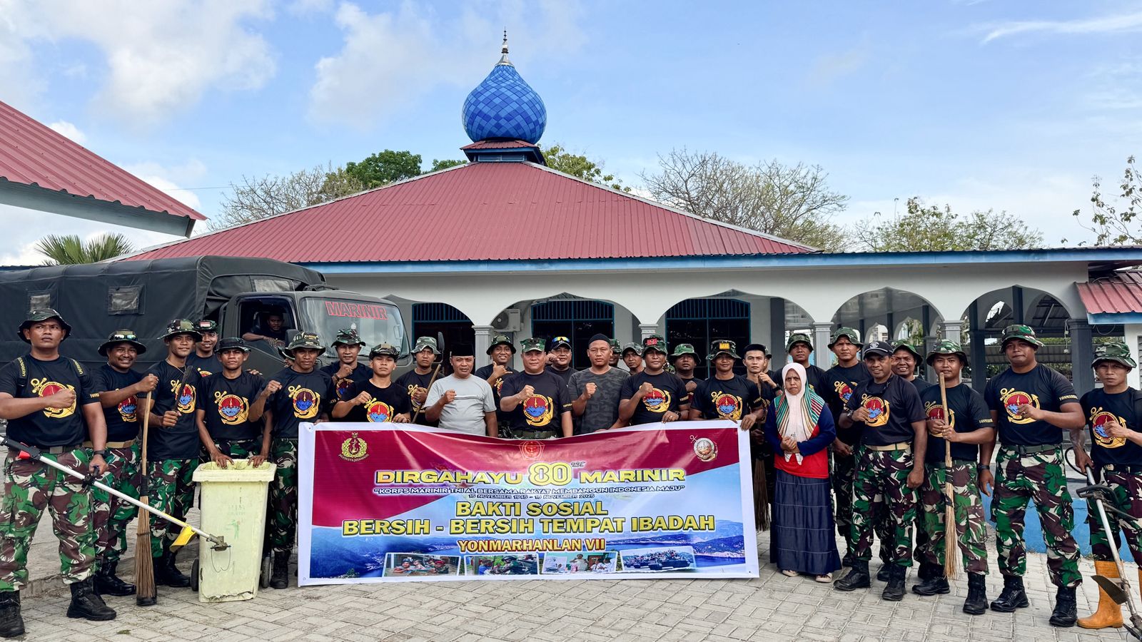 (Kupang) Jelang peringatan HUT ke 80 Korps Marinir, prajurit Batalyon Marinir Pertahanan Pangkalan (Yonmarhanlan) VII Kupang yang dipimpin langsung oleh Komandan Yonmarhanlan VII Kupang Letkol Marinir Fernando S Lumi melaksanakan kegiatan Bhakti Sosial bersih bersih sarana ibadah di beberapa tempat di wilayah Osmok Namosain Kota Kupang Nusa Tenggara Timur. Rabu (05/11/2025) Kegiatan Bhakti sosial sarana ibadah dilaksanakan di tiga titik yakni di Masjid Al Mahdi, Gereja Oekumene Hati Kudus Yesus (HKY) dan Pura Mandala Nata, dalam kegiatan ini prajurit Yonmarhanlan VII bekerjasama dengan masyarakat sekitar melaksanakan pembersihan di sekitar area…