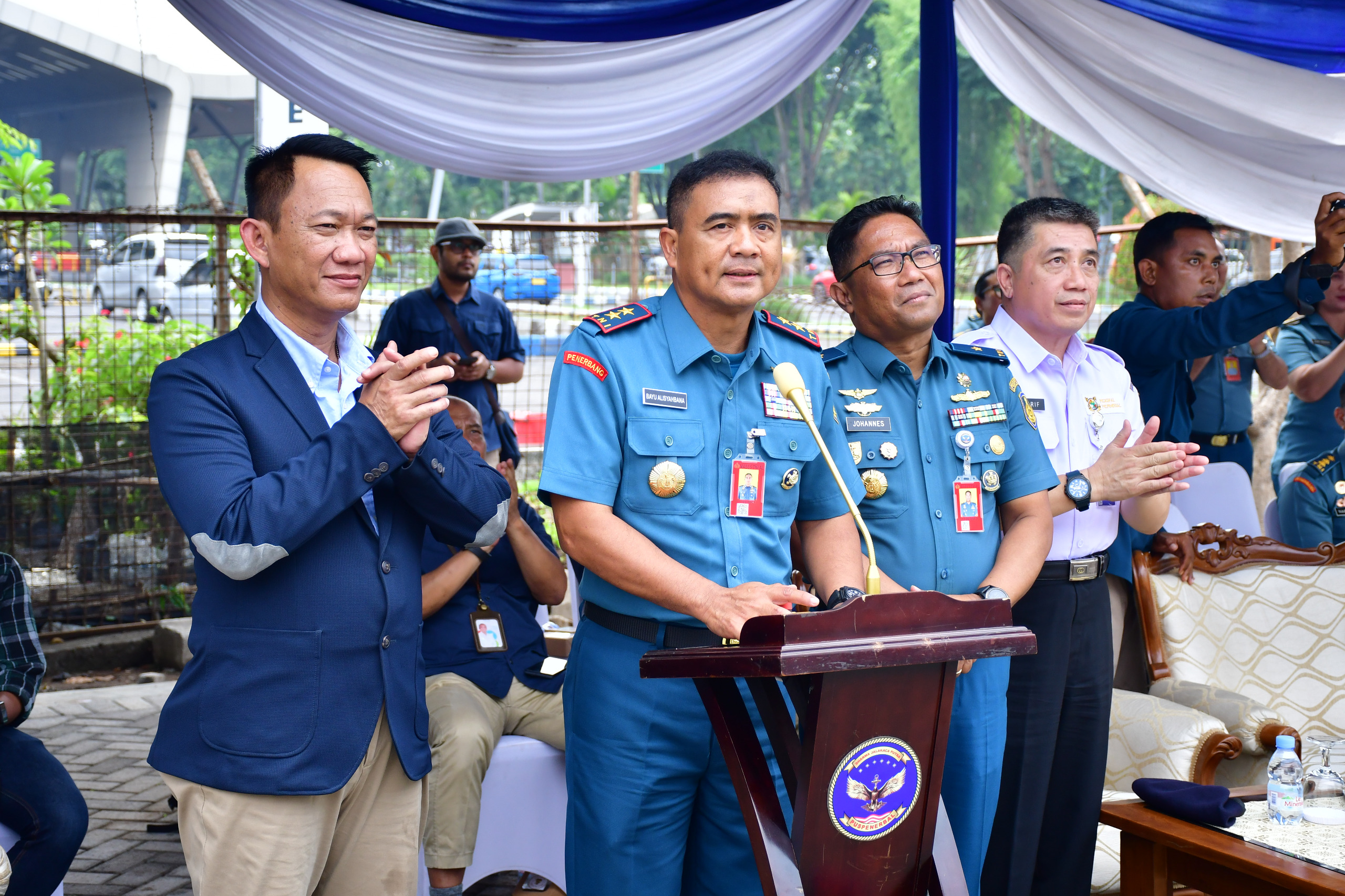 Komandan Pusat Penerbangan TNI Angkatan Laut (Puspenerbal), Laksda TNI Bayu Alisyahbana meresmikan Renovasi Gedung Puskopal Puspenerbal yang ditandai dengan Penandatanganan Prasasti dan Pengguntingan Pita di Gedung Puskopal Puspenerbal yang berlokasi di Gate T2 Bandara Internasional Juanda, Rabu (5/11/2025). Dalam kesempatan tersebut, General Manager Angkasa Pura Indonesia Kantor Cabang Bandar Udara Internasional Juanda Surabaya, Laksma TNI M. Tohir juga secara simbolis meresmikan operasional Armada Trans Juanda Trayek Juanda-Bungurasih dengan penyiraman air kendi. Tampak hadir Inspektur Puspenerbal, Laksma TNl Johannes Tambunan, Direktur Logistik Puspenerbal, Kolonel Laut (T) Johny Setiawan, Direktur Lambangja Puspenerbal,…