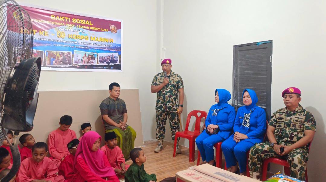 TNI AL, Pasmar 1. Komandan Batalyon Marinir Pertahanan Pangkalan (Danyonmarhanlan) IV Batam Letkol Marinir Tomas Febrianto. M.Tr.Opsla., bersama Ketua Ranting C Cabang 1 Korcab Pasmar 1 Ny. Ummi Tomas Febrianto dan pengurus beserta Perwira Yonmarhanlan IV melaksanakan kegiatan Bakti Sosial ke Panti Asuhan Rezky Ilahi yang ada di Kota Batam, Kamis (06/11/2025).