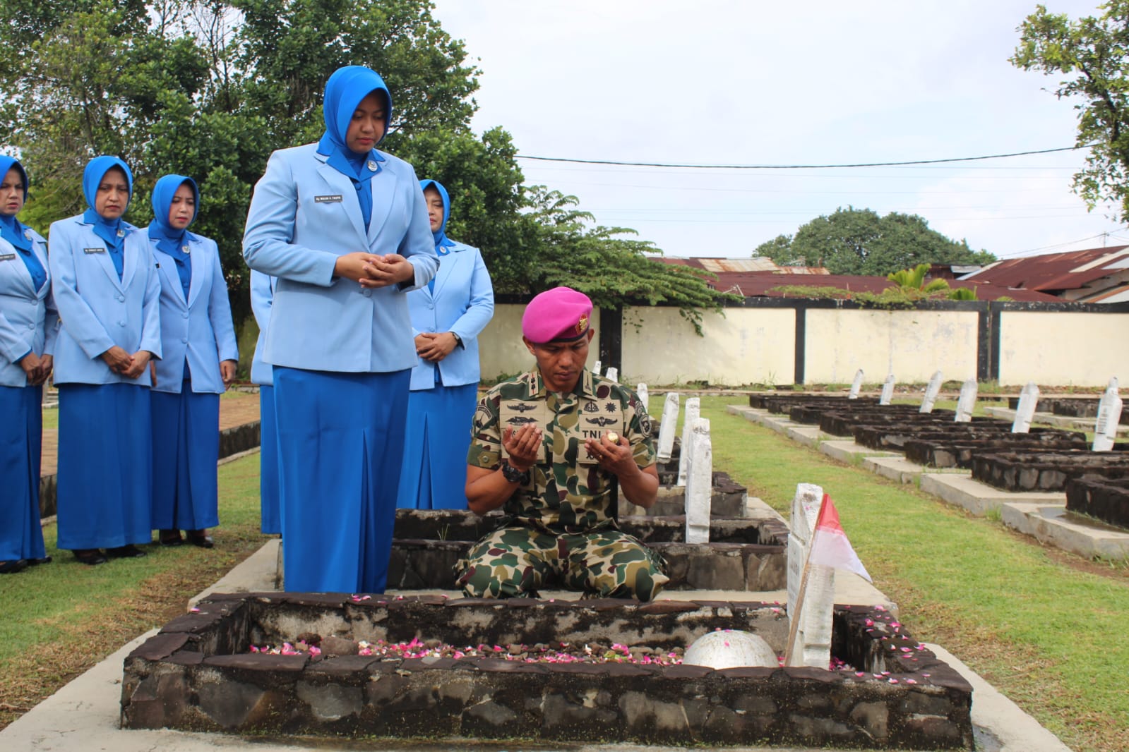 Dengan suasana yang khidmat, Danyonmarhanlan II Letkol Marinir Afrison Taufik melakukan peletakan karangan bunga pada monumen TMP Kusuma Bangsa Padang dan pelaksanaan tabur bunga dengan mengunjungi makam Pahlawan dari Matra Laut dan Korps KKO/Marinir.
