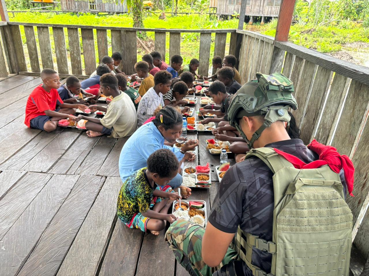 Melalui kegiatan tersebut, para prajurit membagikan makanan bergizi lengkap dengan lauk pauk sehat kepada siswa-siswi sekolah dasar. Kegiatan ini disambut dengan antusias dan keceriaan oleh para siswa yang tampak bersemangat menikmati hidangan yang disiapkan oleh Satgas.
