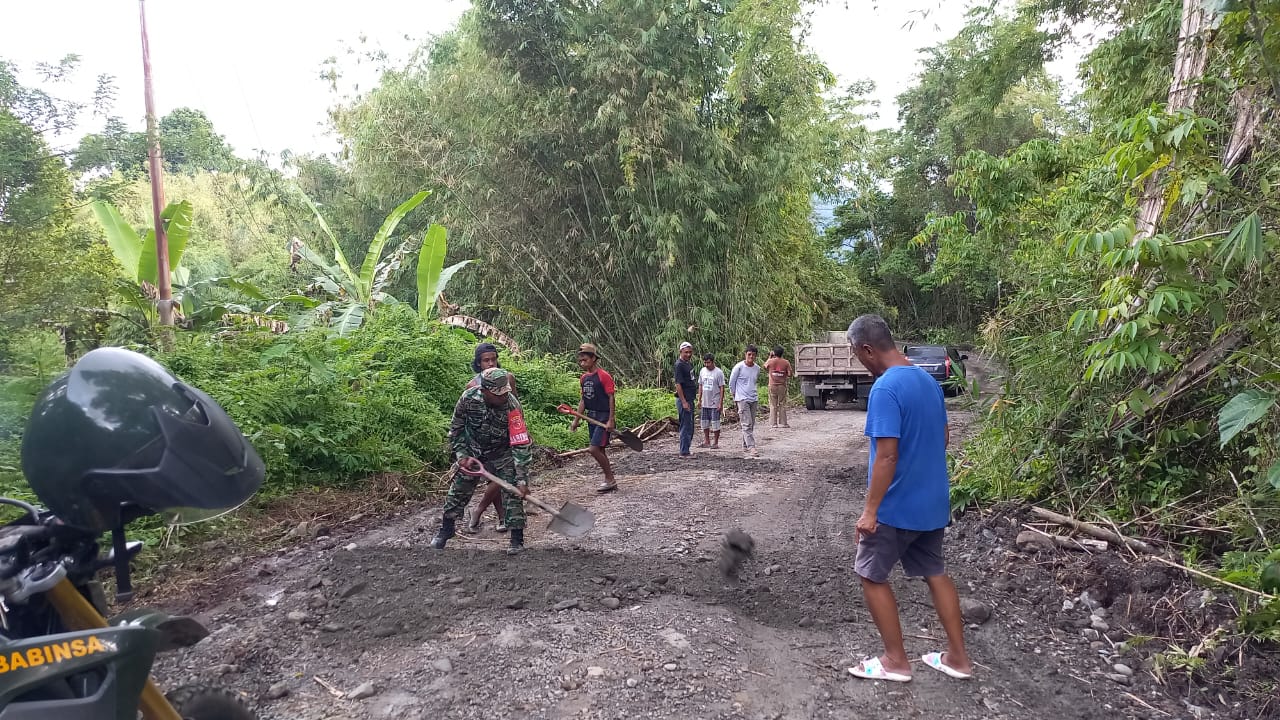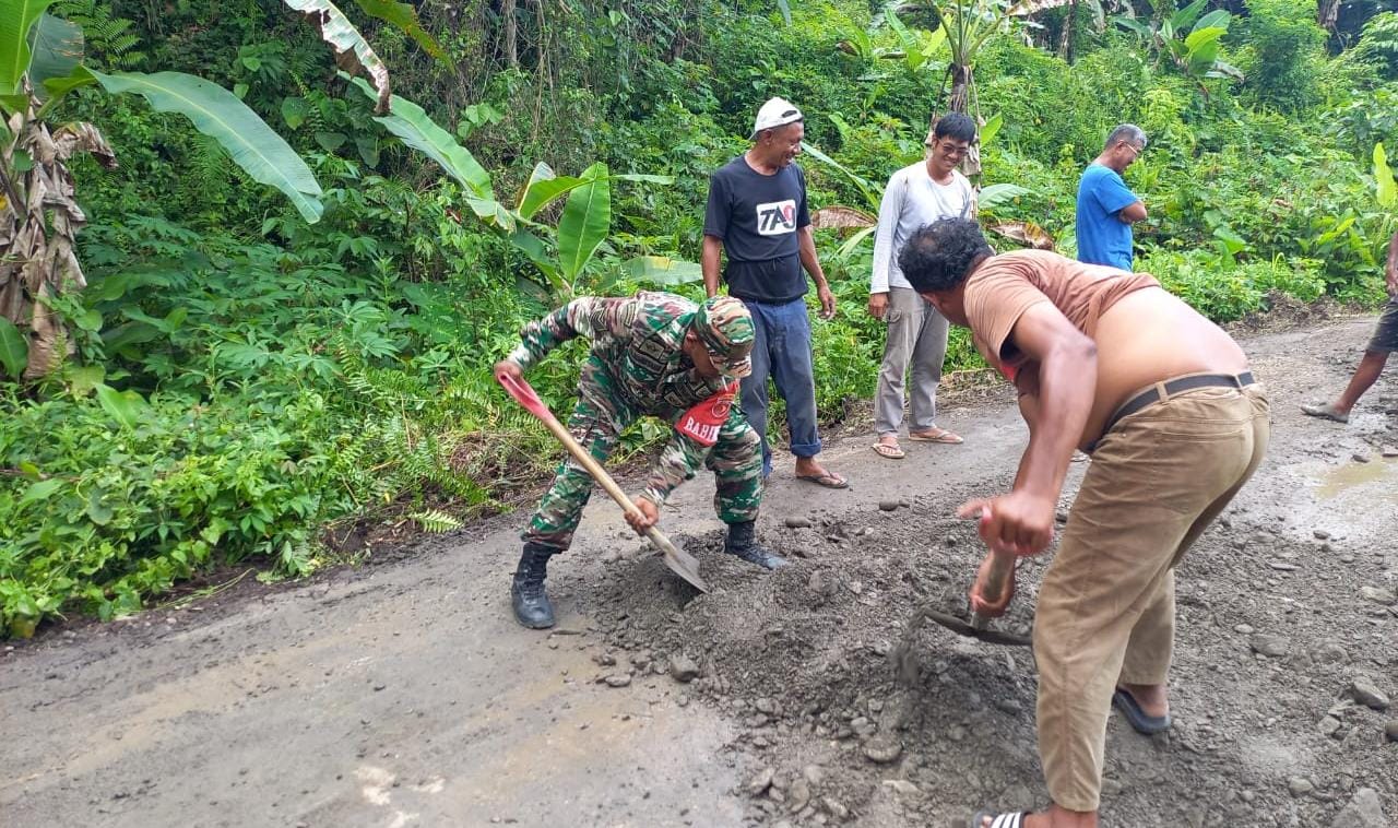 SBB PW Senin, 10 November 2025 — Babinsa Desa Neniari, Kecamatan Taniwel, Kabupaten Seram Bagian Barat, Serka A. Maketake menunjukkan kepeduliannya terhadap kondisi infrastruktur di wilayah binaannya dengan berinisiatif mengajak tokoh pemerintah desa dan masyarakat Desa Neniari untuk bergotong royong memperbaiki jalan yang rusak.