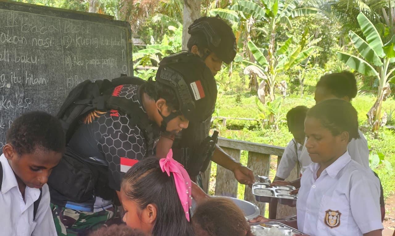 “Anak-anak di sini jarang menikmati makanan bergizi seperti ini. Kehadiran bapak-bapak TNI membuat mereka senang dan termotivasi untuk rajin sekolah,” tutur sang guru penuh haru.