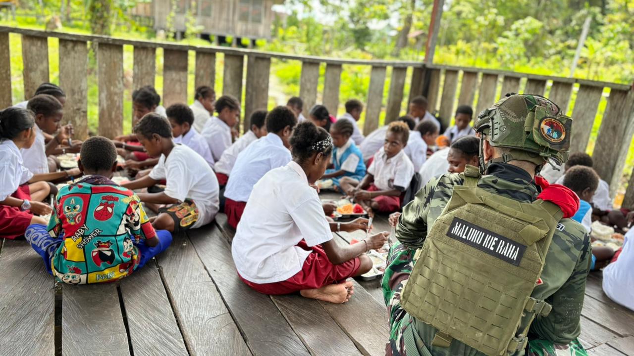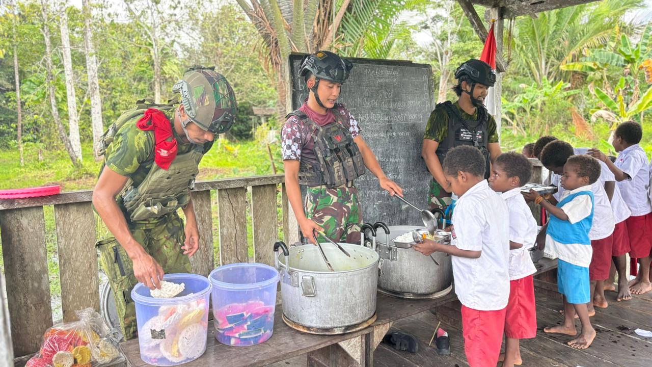 Papua, PW 18 November 2025 — Satgas Pamtas Mobile Yonif 733/Masariku melaksanakan program “Masariku Peduli Gizi” di SD Rimba YPPK Yan Smit Mumugu 2, Distrik Krepkuri, dengan membagikan makanan bergizi kepada para siswa sebagai upaya meningkatkan kesehatan dan semangat belajar anak-anak di wilayah pedalaman Papua.
