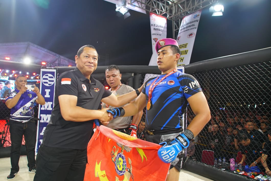 TNI AL, Pasmar 1. Prajurit Detasemen Intai Amfibi 1 Marinir (Denipam 1 Mar) kembali meraih prestasi pada Kejuaraan Nasional IBCA-MMA (Indonesia Bela Diri Campuran Amatir-Mixed Martial Art) Piala Dankor Brimob 2025 yang dilaksanakan di Mako Brimob Polri, Kelapa Dua, Depok. Jawa Barat, Jumat (21/11/2024). Pada kejurnas kali ini, para petarung saling menunjukan, bakat, semangat, serta sportivitas yang tinggi demi meraih gelar juara dan berkompetisi pada ajang nasional maupun internasional. Pratu Mar Ganda Kurniawan yang tergabung dalam Pemprov Banten menorehkan prestasi dikelas 61 kg Full MMA, dengan penuh semangat membara dan…