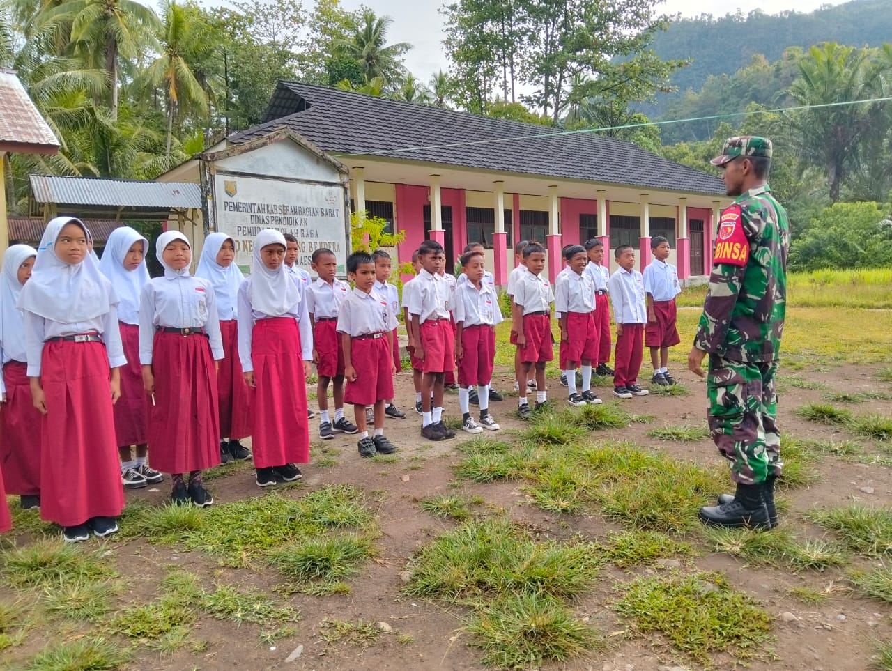 SBB PW Senin, 01 Desember 2025 — Babinsa Koramil 1513-01/Piru, Desa Persiapan Tiang Bendera, Kecamatan Huamual Belakang, Serda La Ode Salmin, melaksanakan kegiatan Wawasan Kebangsaan (Wanwil) melalui pemberian materi baris berbaris kepada siswa-siswi SD Negeri 2 Tiang Bendera.