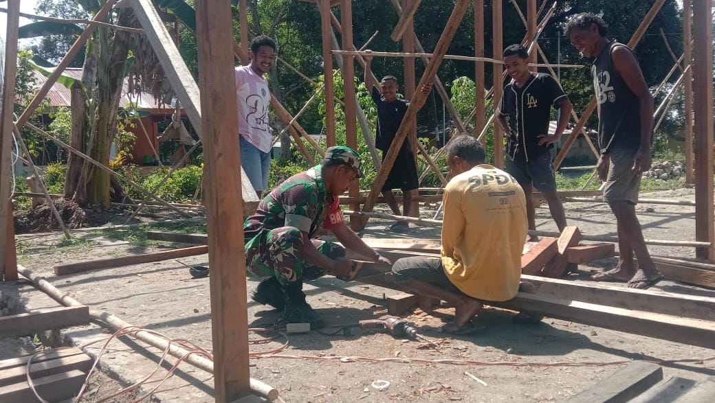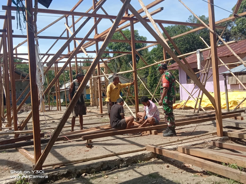 Pada kesempatan ini, Serma Jansen bersama beberapa warga turut membantu proses pembangunan rumah milik Bapak Yopi Makulua dengan melaksanakan kegiatan pemasangan baut untuk menyambungkan kayu sebagai rangka utama rumah.