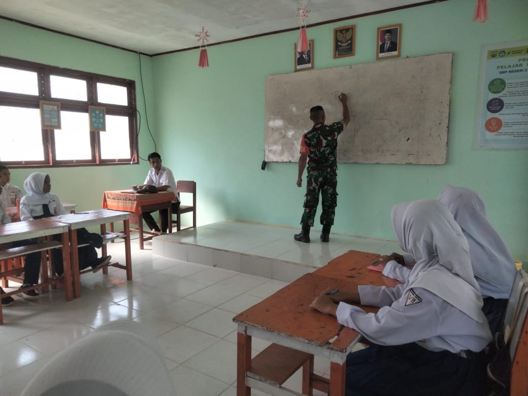 SBB PW Kamis, 04 Desember 2025, Babinsa Koramil 1513-01/Piru yang bertugas di Dusun Pelita Jaya, Desa Eti, Kecamatan Seram Barat, Koptu La Basri, melaksanakan kegiatan perlawanan wilayah (Wanwil) melalui pemberian materi teori Peraturan Baris Berbaris (PBB) kepada para siswa-siswi di SMP Negeri 2 Seram Barat.