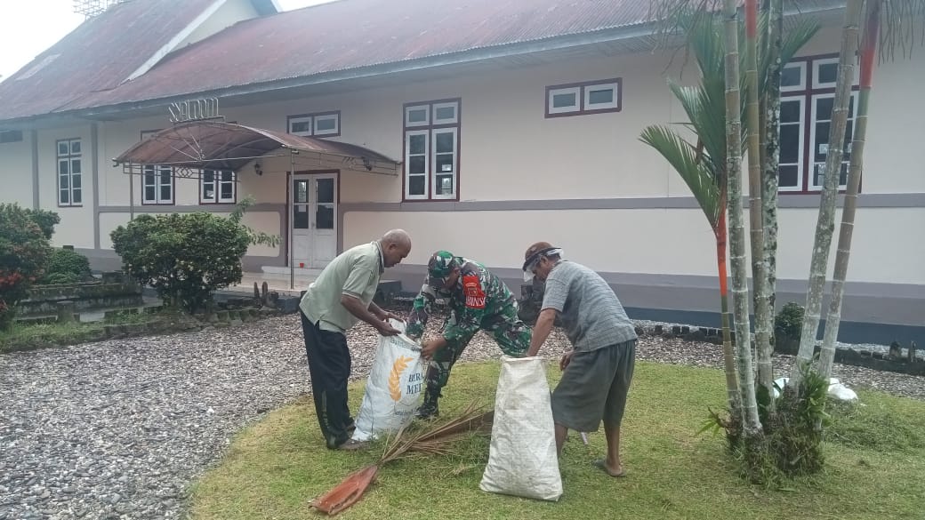 Dalam kegiatan tersebut, Babinsa bersama anggota majelis jemaat secara gotong royong membersihkan rumput liar, menyapu halaman gereja, serta mengumpulkan sampah yang berserakan di sekitar lingkungan gereja.