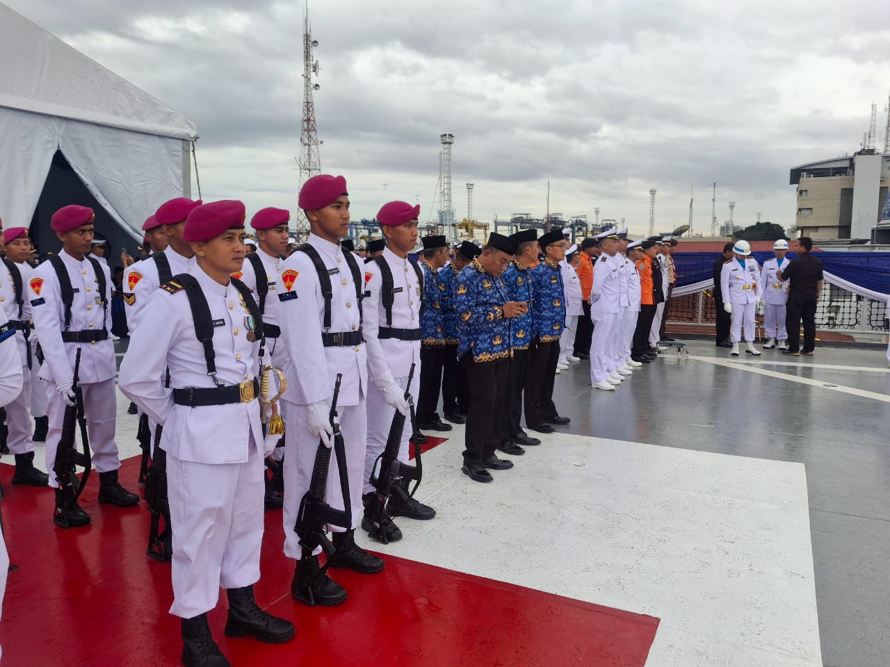 Jakarta, PW: TNI AL, Dispen Kormar, Pasmar 1. Prajurit Batalyon Arhanud 1 Marinir mengikuti upacara peringatan Hari Dharma Samudra yang dipimpin langsung oleh Kepala Staf TNI Angkatan Laut Laksamana TNI Dr. Muhammad Ali, S.E., M.M., M.Tr.Opsla., yang dilaksanakan di KRI dr. Radjiman Wedyodiningrat-992, Markas Komando Lintas Laut Militer (Kolinlamil), Jakarta Utara, Kamis (15/01/2025).