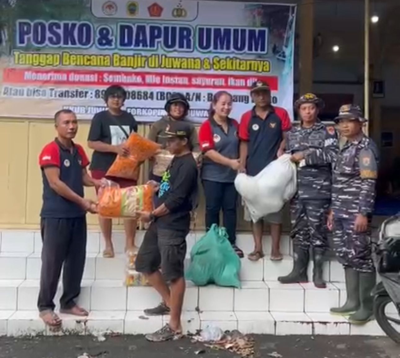 Dapur umum yang berlokasi di Kantor Kecamatan Juwana tersebut dioperasikan oleh prajurit Pos TNI AL (Posal) Juwana dengan dukungan dan kolaborasi prajurit Posal Rembang. Sejak pagi hari, prajurit TNI AL bergerak cepat menyiapkan dan memasak makanan siap saji untuk kemudian didistribusikan kepada masyarakat yang terdampak banjir.