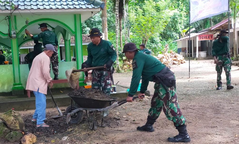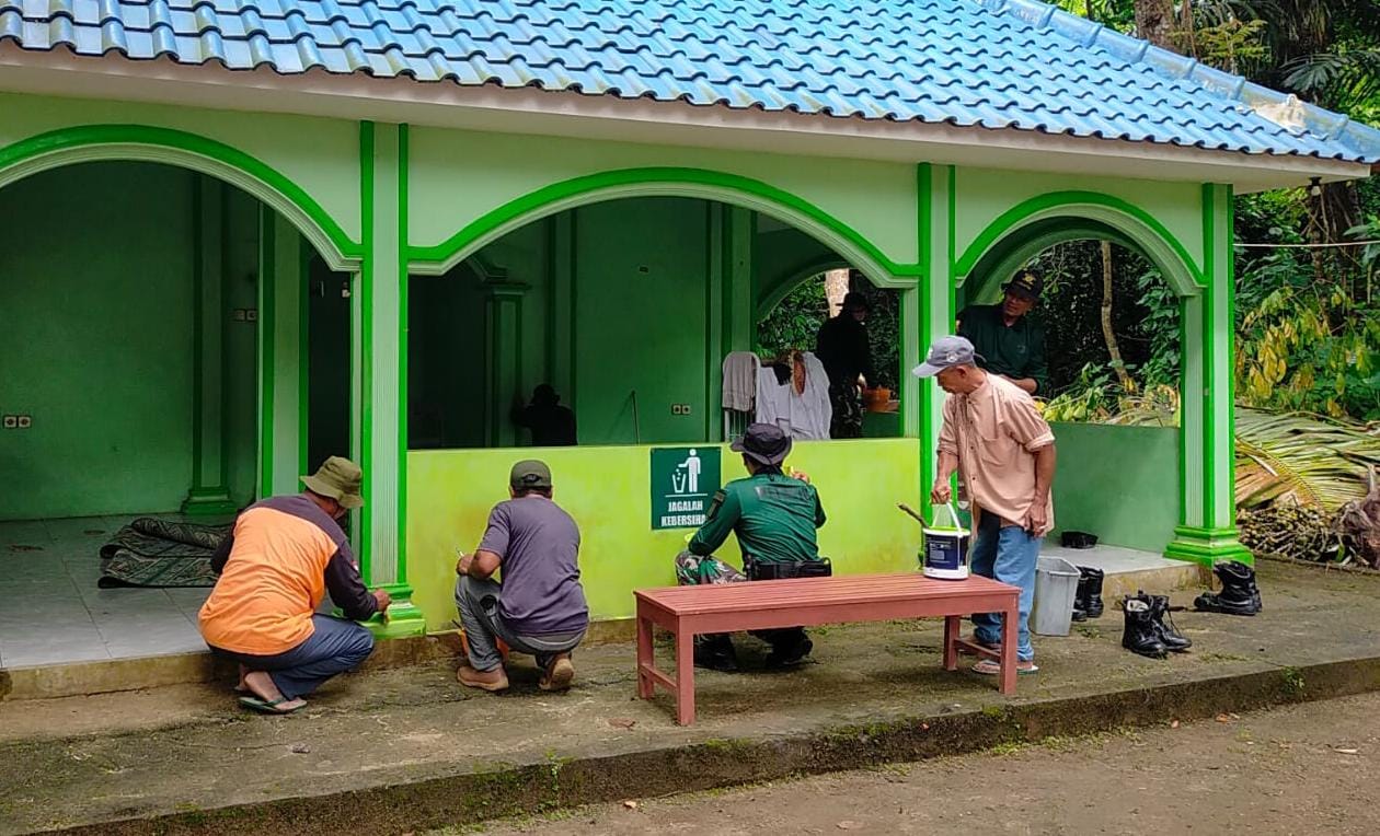 Pelatih Puslatpurmar 4 purboyo dan warga sekitar saling bahu membahu membersihkan area dalam masjid dan lingkungan sekitar luar masjid agar lebih nyaman.