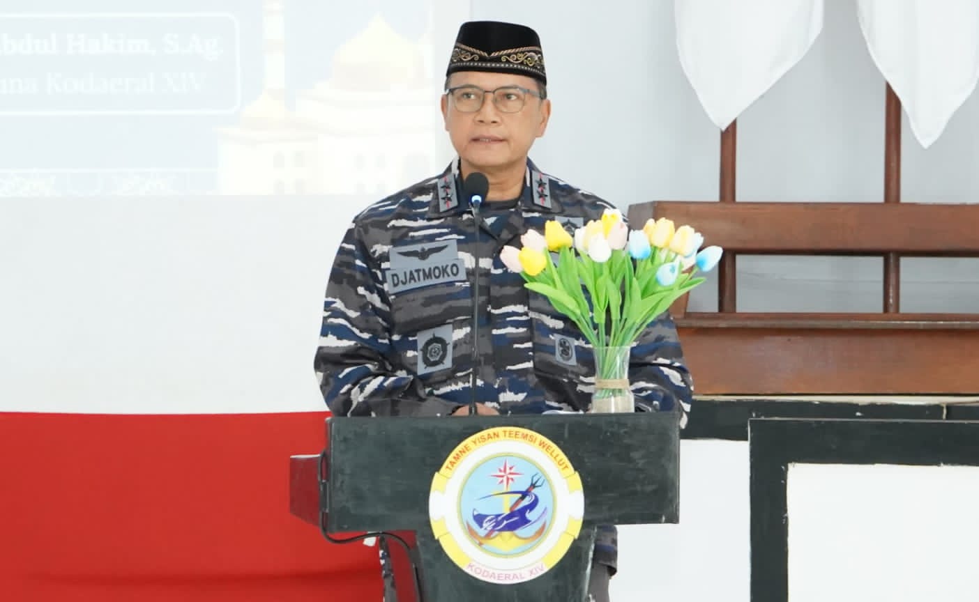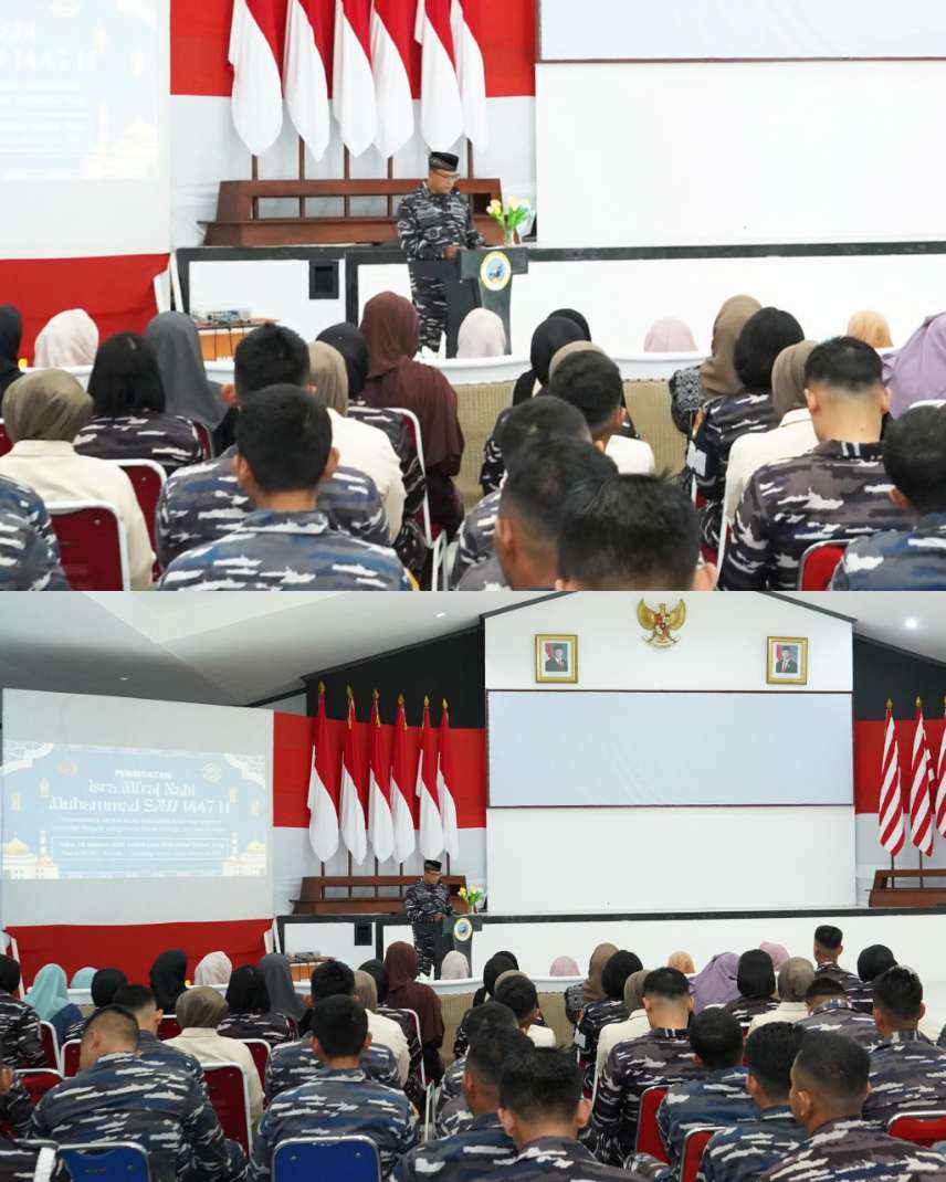 TNI AL. Sorong – Jadikan momentum peringatan Isra Mi’raj sebagai pengingat dalam memperkuat hubungan kita dengan Allah SWT melalui ibadah, serta hubungan dengan sesama melalui pengabdian yang tulus, demikian dikatakan Komandan Komando Daerah TNI Angkatan Laut XIV (Komandan Kodaeral XIV), Laksamana Muda TNI Djatmoko, S.T., M.M., CHRMP, dalam sambutannya pada acara peringatan Isra Mi’raj Nabi Muhammad SAW 1447 Hijriah/2026 M, yang dilaksanakan di GSG Kodaeral XIV Mako Kodaeral XIV Distrik Sorong Manoi, Kota Sorong Papua Barat Daya. Rabu (28/01/2026).