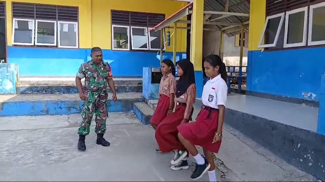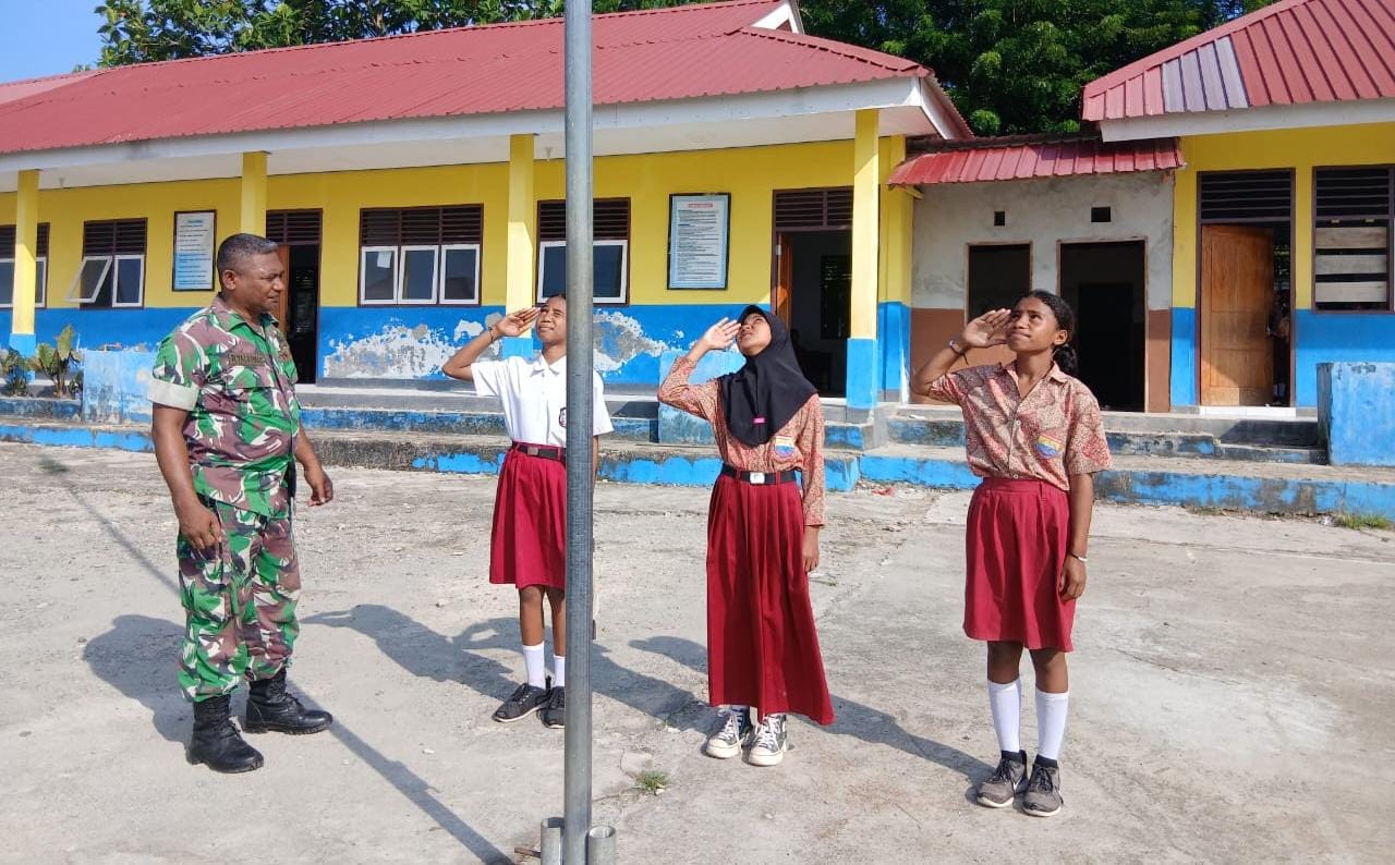 SBB PW Rabu, 28 Januari 2026, Babinsa Koramil 1513-01/Piru, Serda Rolean Talahatu, melaksanakan kegiatan Wawasan dan Pembinaan Mental (Wanmil) berupa pemberian materi baris-berbaris serta latihan tata cara pengibaran bendera kepada siswa-siswi SD Negeri 3 Piru. Desa piru kec seram barat kab SBB.