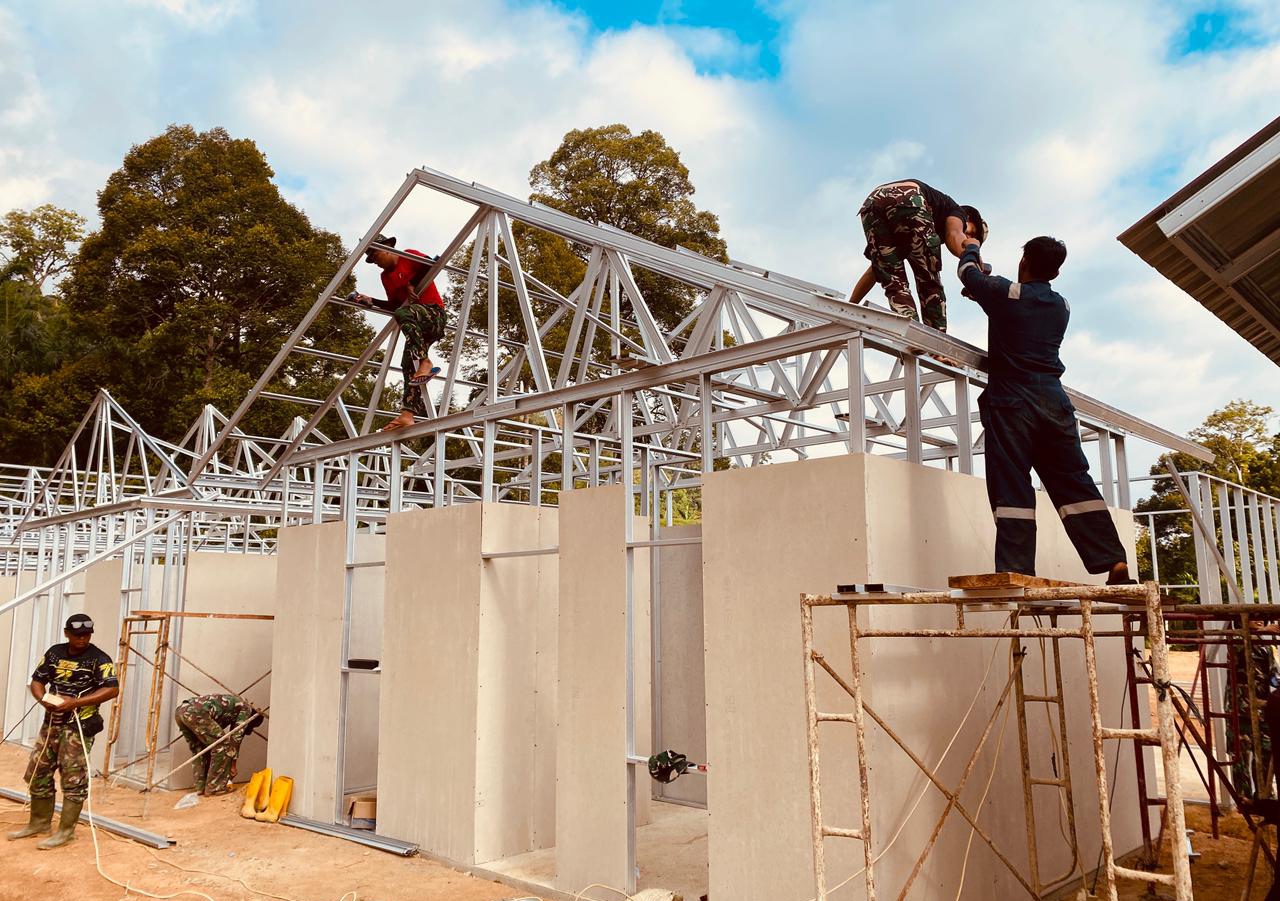 Pembangunan hunian sementara tersebut dilaksanakan secara bertahap dengan melibatkan prajurit Yonif 6 Marinir TNI AL yang mempunyai kemampuan dan keahlian pada bidang konstruksi.