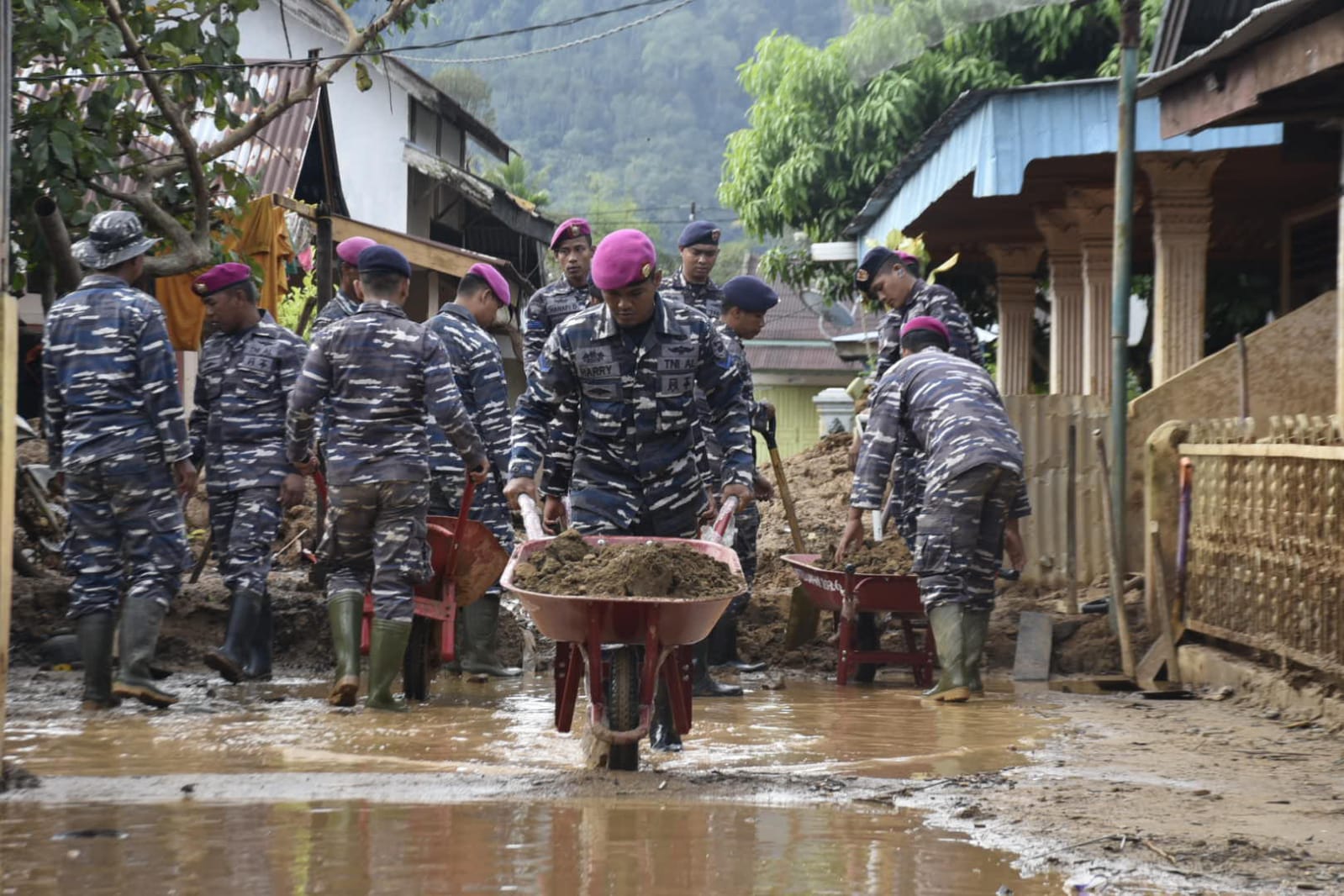 Aksi gotong royong tersebut dilakukan untuk mempercepat proses pemulihan lingkungan sekaligus mengembalikan aktivitas masyarakat agar dapat berjalan normal kembali. Dengan peralatan sederhana, prajurit TNI AL bekerja tanpa mengenal lelah bersama warga setempat membersihkan sisa material yang terbawa arus banjir bandang.