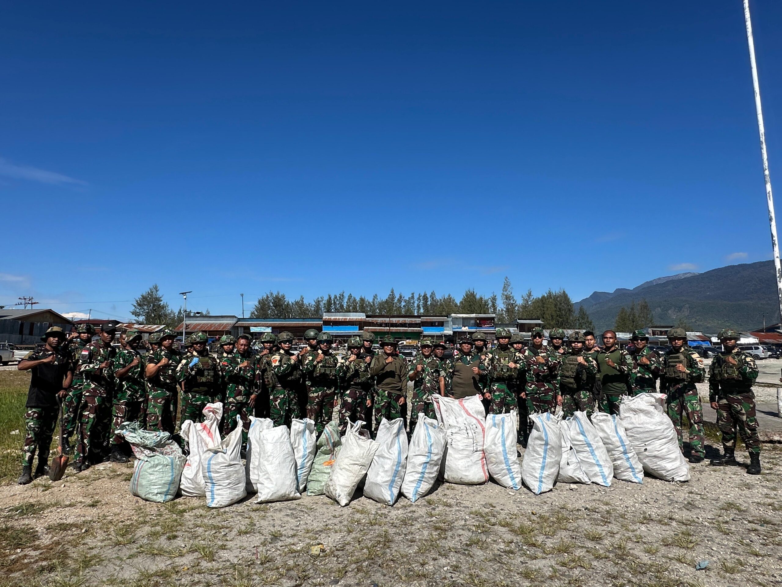 Papua, PW: TNI AL, Dispen Kormar, Pasmar 1. Prajurit Satuan Tugas (Satgas) Pengamanan Perbatasan (Pamtas) RI-PNG 2025 Batalyon Infanteri (Yonif) 4 Marinir dalam rangka meningkatkan kepedulian terhadap lingkungan serta membeli hasil tani masyarakat di wilayah binaan, melaksanakan kegiatan karya bakti dan program komsos, bertempat di Distrik Waghete, Kabupaten Paniai, Papua Tengah, Minggu (08/02/2026). Kegiatan gotong royong tersebut difokuskan pada pembersihan lingkungan dan jalan raya, bersama masyarakat setempat bahu-membahu membersihkan dan mengumpulkan sampah yang berserakan tidak pada tempatnya mencegah kerusakan lingkungan yang lebih parah. Prajurit Satgas Yonif 4 Marinir berkomitmen membantu…