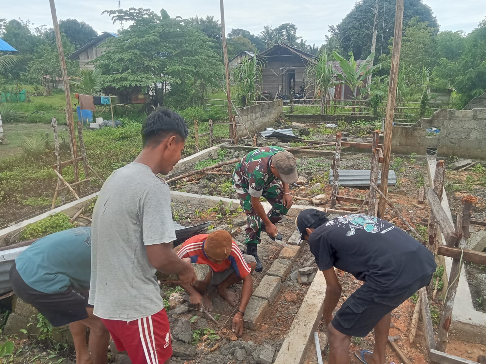 Dalam kegiatan tersebut, Serka Hendrik Palot bersama warga saling bahu-membahu menyusun batako dengan rapi agar bangunan rumah dapat berdiri kokoh dan sesuai rencana.