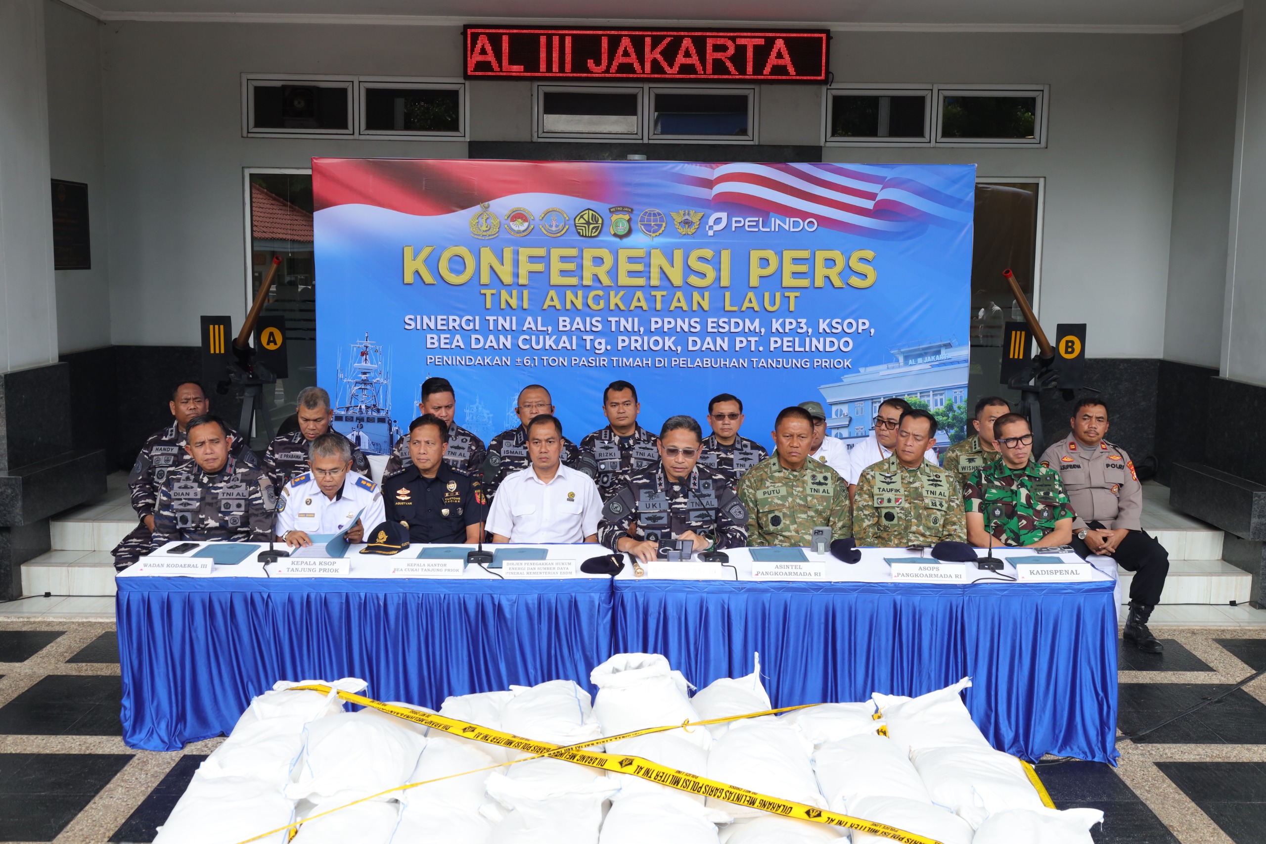 Jakarta, 9 Maret 2026 — TNI AL dalam hal ini Komando Daerah TNI Angkatan Laut (Kodaeral) III bersama tim gabungan lintas instansi berhasil menggagalkan upaya penyelundupan pasir timah ilegal sebanyak 122 karung dengan berat total mencapai ± 6,1 ton. Penindakan ini dilakukan di Dermaga 107, Pelabuhan Tanjung Priok, Jakarta Utara, pada Jumat (6/3). Hal tersebut disampaikan Komandan Kodaeral III, Laksamana Muda TNI Uki Prasetia, S.T., M.M., dalam konferensi pers yang digelar di Makodaeral III, pada Senin, (9/3). Dankodaeral lll menyampaikan bahwa keberhasilan ini merupakan hasil sinergi ketat antara TNI…