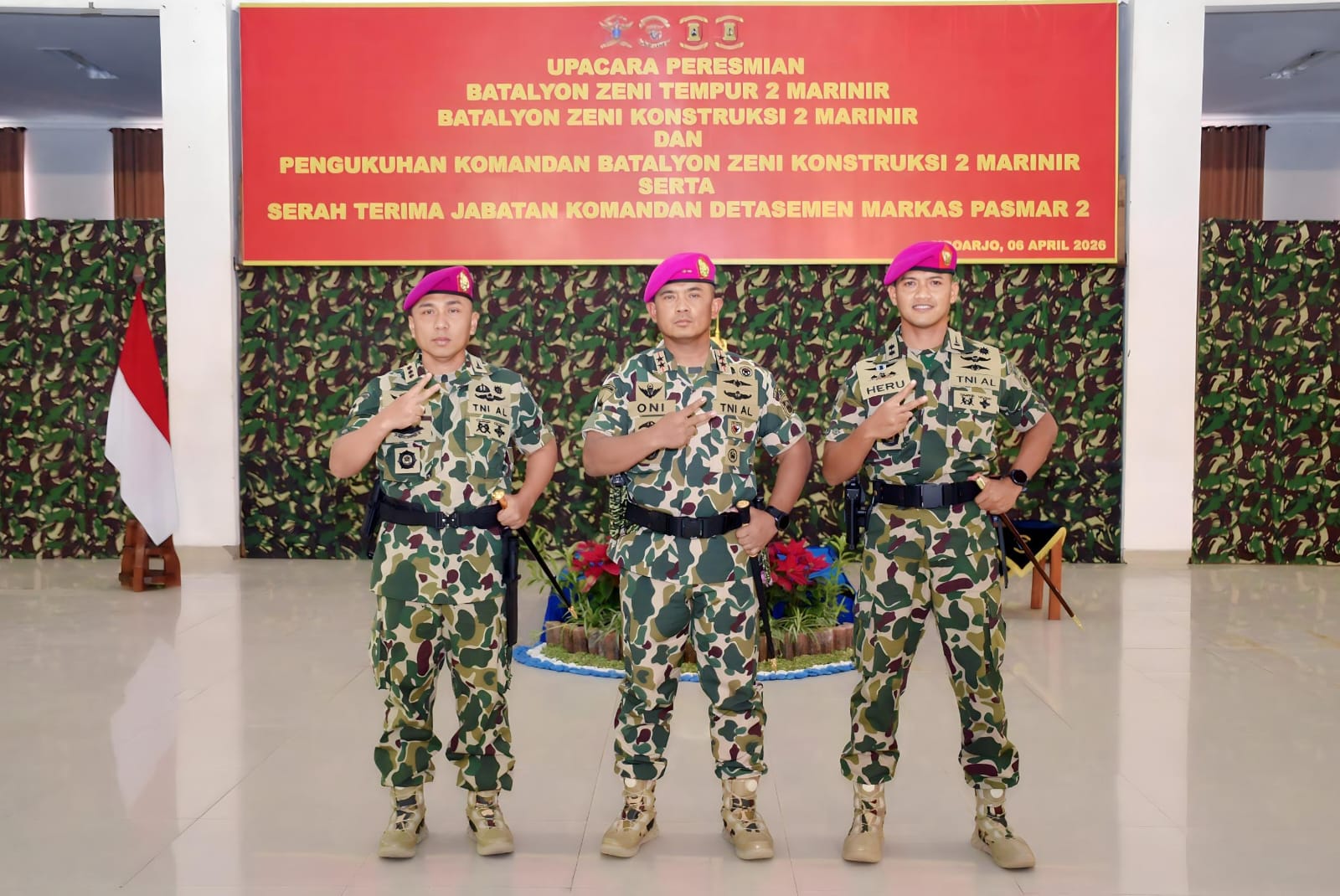 Dispen Kormar TNI Angkatan Laut (Sidoarjo) PW : Komandan Pasmar 2 Mayjen TNI (Mar) Dr. Oni Junianto meresmikan Batalyon Zeni Konstruksi 2 Marinir (Yonzikon 2 Mar) dan Batalyon Zeni Tempur 2 Marinir (Yonzipur 2 Mar), yang digelar di Graha Gafur Chalik Mako Pasmar 2, Kesatrian Marinir Moekijat, Gedangan, Sidoarjo, Senin (06/04/2026).